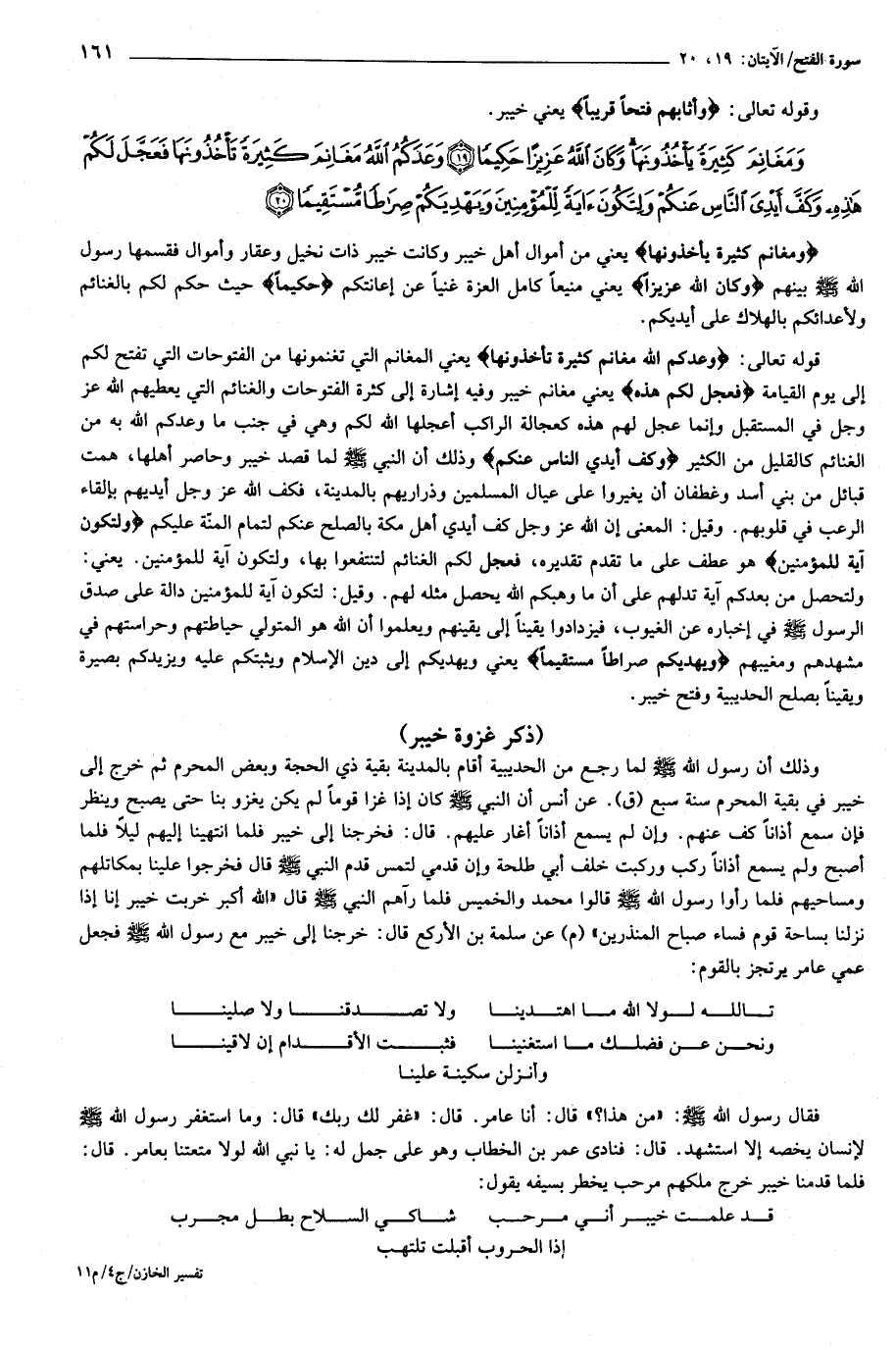 وَمَغانِمَ كَثِيرَةً يَأْخُذُونَها وَكانَ اللَّهُ عَزِيزاً حَكِيماً (19) وَعَدَكُمُ اللَّهُ مَغانِمَ كَثِيرَةً تَأْخُذُونَها فَعَجَّلَ لَكُمْ هذِهِ وَكَفَّ أَيْدِيَ النَّاسِ عَنْكُمْ وَلِتَكُونَ آيَةً لِلْمُؤْمِنِينَ وَيَهْدِيَكُمْ صِراطاً مُسْتَقِيماً (20)