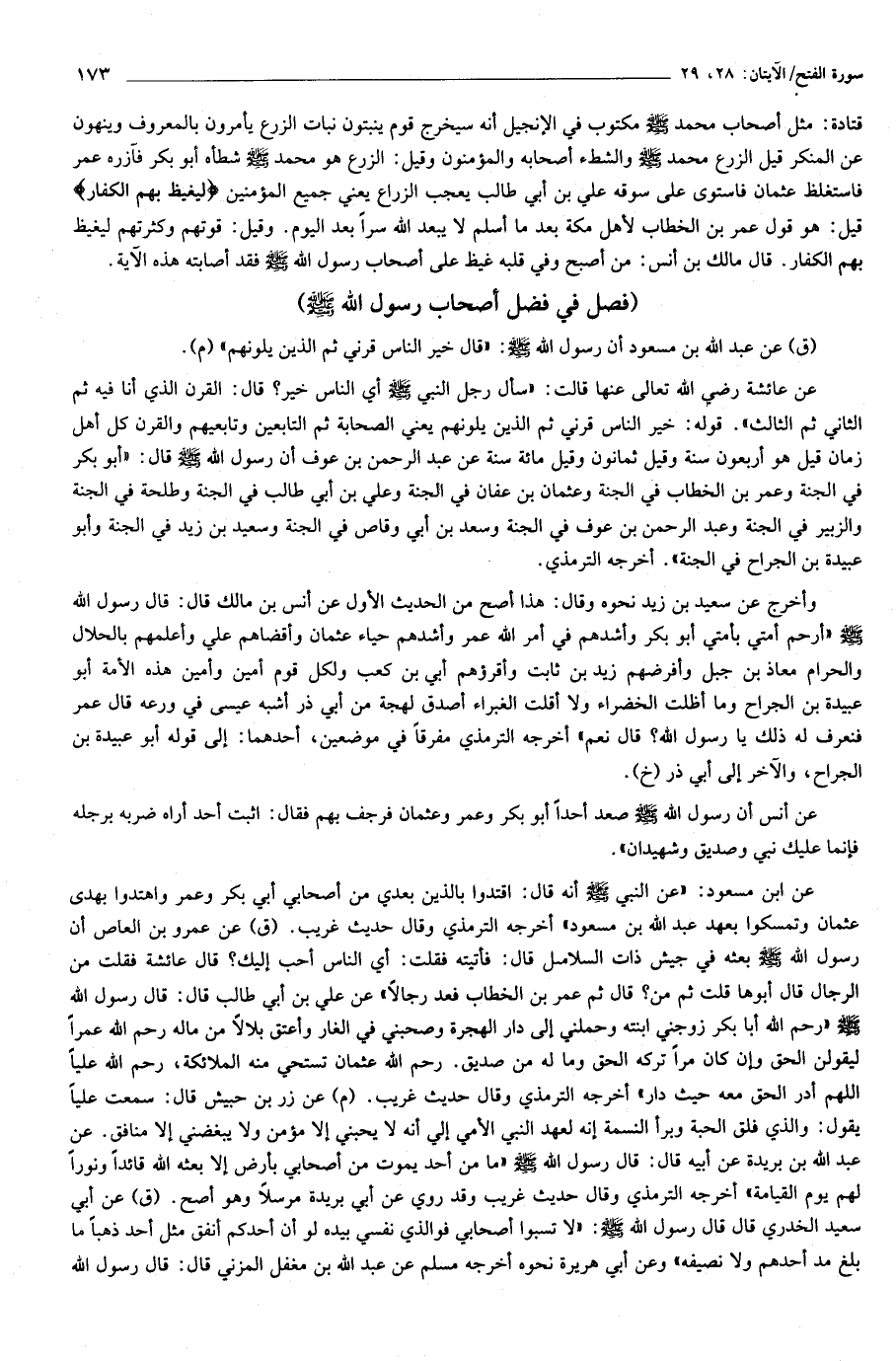 (فصل في فضل أصحاب رسول الله صلّى الله عليه وسلّم) (ق) عن عبد الله بن مسعود أن رسول الله صلّى الله عليه وسلّم: «قال خير الناس قرني ثم الذين يلونهم» (م).