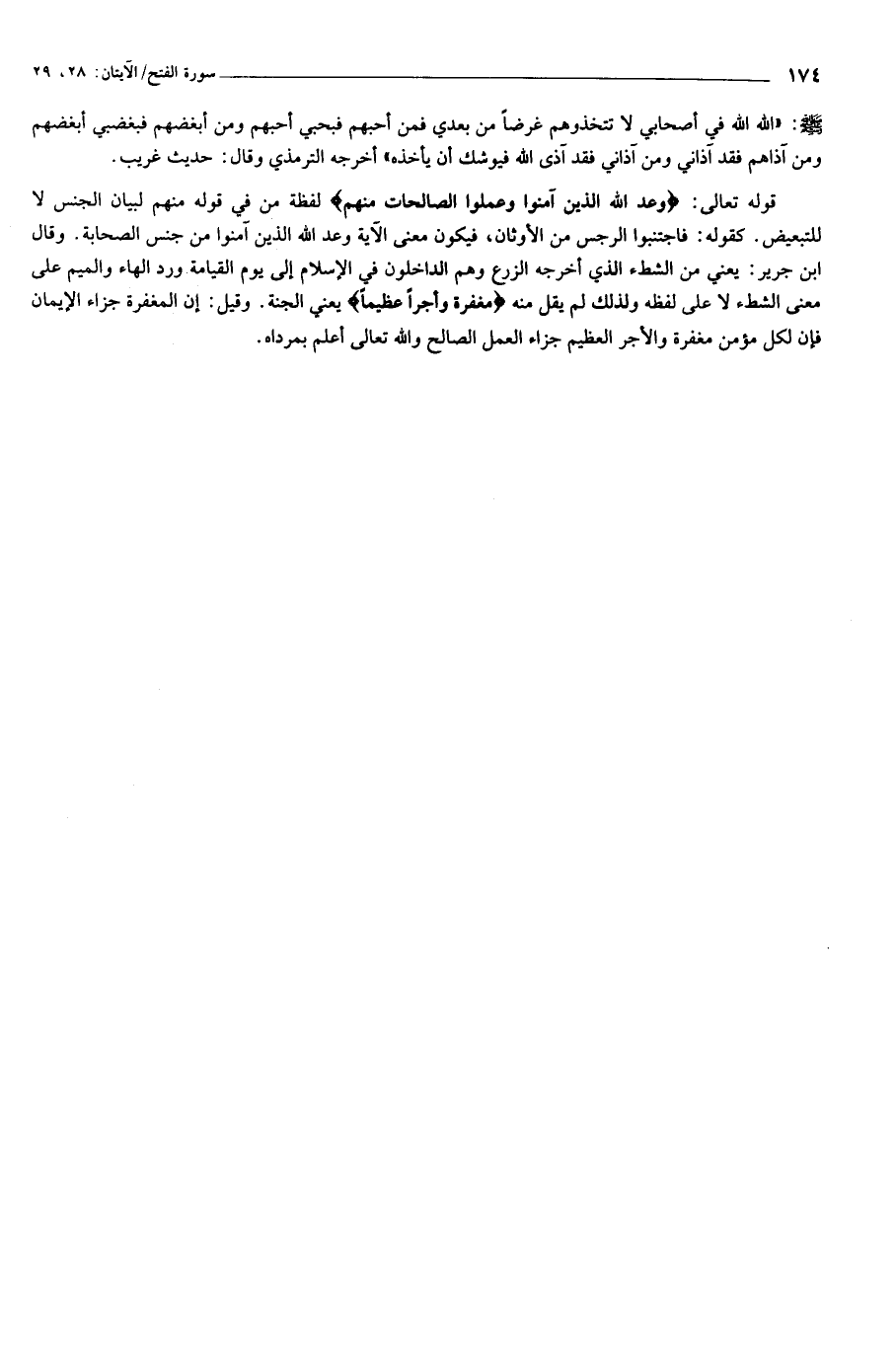قوله تعالى: وَعَدَ اللَّهُ الَّذِينَ آمَنُوا وَعَمِلُوا الصَّالِحاتِ مِنْهُمْ لفظة من في قوله منهم لبيان الجنس لا للتبعيض. كقوله: فاجتنبوا الرجس من الأوثان، فيكون معنى الآية وعد الله الذين آمنوا من جنس الصحابة. وقال ابن جرير: يعني من الشطء الذي أخرجه الزرع وهم الداخلون في الإسلام إلى يوم القيامة ورد الهاء والميم على معنى الشطء لا على لفظه ولذلك لم يقل منه مَغْفِرَةً وَأَجْراً عَظِيماً يعني الجنة. وقيل: إن المغفرة جزاء الإيمان فإن لكل مؤمن مغفرة والأجر العظيم جزاء العمل الصالح والله تعالى أعلم بمراده.