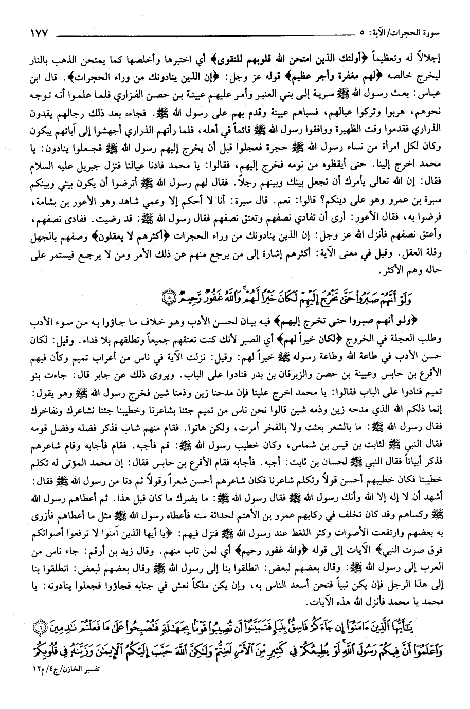 أشهد أن لا إله إلا الله وأنك رسول الله صلّى الله عليه وسلّم فقال رسول الله صلّى الله عليه وسلّم: ما يضرك ما كان قبل هذا. ثم أعطاهم رسول الله صلّى الله عليه وسلّم وكساهم وقد كان تخلف في ركابهم عمرو بن الأهتم لحداثة سنه فأعطاه رسول الله صلّى الله عليه وسلّم مثل ما أعطاهم فأزرى به بعضهم وارتفعت الأصوات وكثر اللغط عند رسول الله صلّى الله عليه وسلّم فنزل فيهم: يا أَيُّهَا الَّذِينَ آمَنُوا لا تَرْفَعُوا أَصْواتَكُمْ فَوْقَ صَوْتِ النَّبِيِّ الآيات إلى قوله وَاللَّهُ غَفُورٌ رَحِيمٌ أي لمن تاب منهم. وقال زيد بن أرقم: جاء ناس من العرب إلى رسول الله صلّى الله عليه وسلّم: وقال بعضهم لبعض: انطلقوا بنا إلى رسول الله صلّى الله عليه وسلّم وقال بعضهم لبعض: انطلقوا بنا إلى هذا الرجل فإن يكن نبيا فنحن أسعد الناس به، وإن يكن ملكا نعش في جنابه فجاؤوا فجعلوا ينادونه: يا محمد يا محمد فأنزل الله هذه الآيات.