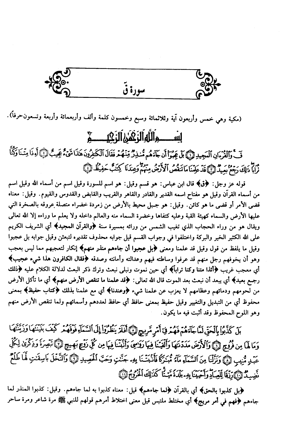 ق وَالْقُرْآنِ الْمَجِيدِ (1) بَلْ عَجِبُوا أَنْ جاءَهُمْ مُنْذِرٌ مِنْهُمْ فَقالَ الْكافِرُونَ هذا شَيْءٌ عَجِيبٌ (2) أَإِذا مِتْنا وَكُنَّا تُراباً ذلِكَ رَجْعٌ بَعِيدٌ (3) قَدْ عَلِمْنا ما تَنْقُصُ الْأَرْضُ مِنْهُمْ وَعِنْدَنا كِتابٌ حَفِيظٌ (4)