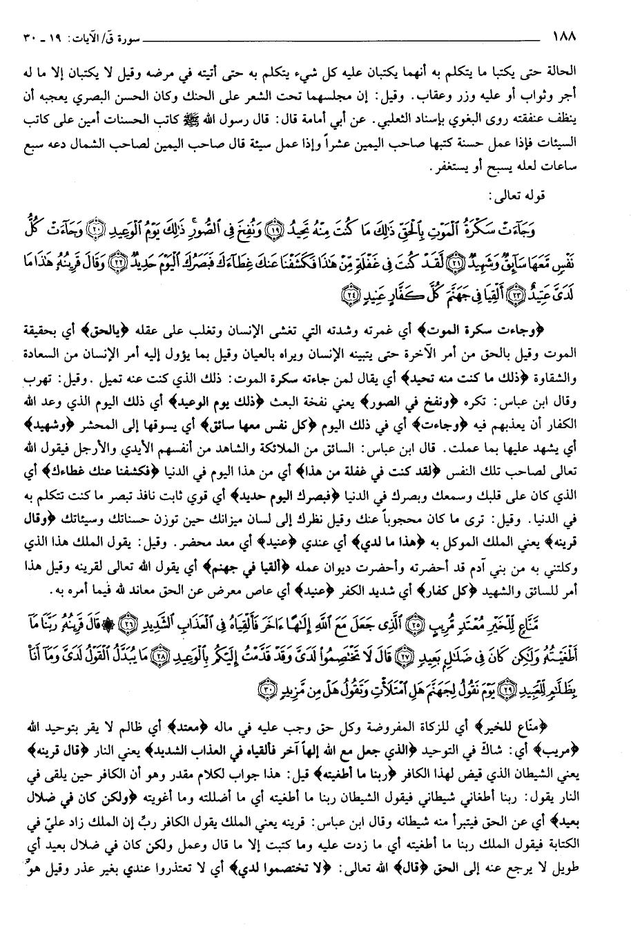 وَجاءَتْ سَكْرَةُ الْمَوْتِ أي غمرته وشدته التي تغشى الإنسان وتغلب على عقله بِالْحَقِّ أي بحقيقة الموت وقيل بالحق من أمر الآخرة حتى يتبينه الإنسان ويراه بالعيان وقيل بما يؤول إليه أمر الإنسان من السعادة والشقاوة ذلِكَ ما كُنْتَ مِنْهُ تَحِيدُ أي يقال لمن جاءته سكرة الموت: ذلك الذي كنت عنه تميل. وقيل: تهرب وقال ابن عباس: تكره وَنُفِخَ فِي الصُّورِ يعني نفخة البعث ذلِكَ يَوْمُ الْوَعِيدِ أي ذلك اليوم الذي وعد الله الكفار أن يعذبهم فيه وَجاءَتْ أي في ذلك اليوم كُلُّ نَفْسٍ مَعَها سائِقٌ أي يسوقها إلى المحشر وَشَهِيدٌ أي يشهد عليها بما عملت. قال ابن عباس: السائق من الملائكة والشاهد من أنفسهم الأيدي والأرجل فيقول الله تعالى لصاحب تلك النفس لَقَدْ كُنْتَ فِي غَفْلَةٍ مِنْ هذا أي من هذا اليوم في الدنيا فَكَشَفْنا عَنْكَ غِطاءَكَ أي الذي كان على قلبك وسمعك وبصرك في الدنيا فَبَصَرُكَ الْيَوْمَ حَدِيدٌ أي قوي ثابت نافذ تبصر ما كنت تتكلم به في الدنيا. وقيل: ترى ما كان محجوبا عنك وقيل نظرك إلى لسان ميزانك حين توزن حسناتك وسيئاتك وَقالَ قَرِينُهُ يعني الملك الموكل به هذا ما لَدَيَّ أي عندي عَتِيدٌ أي معد محضر. وقيل: يقول الملك هذا الذي وكلتني به من بني آدم قد أحضرته وأحضرت ديوان عمله أَلْقِيا فِي جَهَنَّمَ أي يقول الله تعالى لقرينه وقيل هذا أمر للسائق والشهيد كُلَّ كَفَّارٍ أي شديد الكفر عَنِيدٍ أي عاص معرض عن الحق معاند لله فيما أمره به.