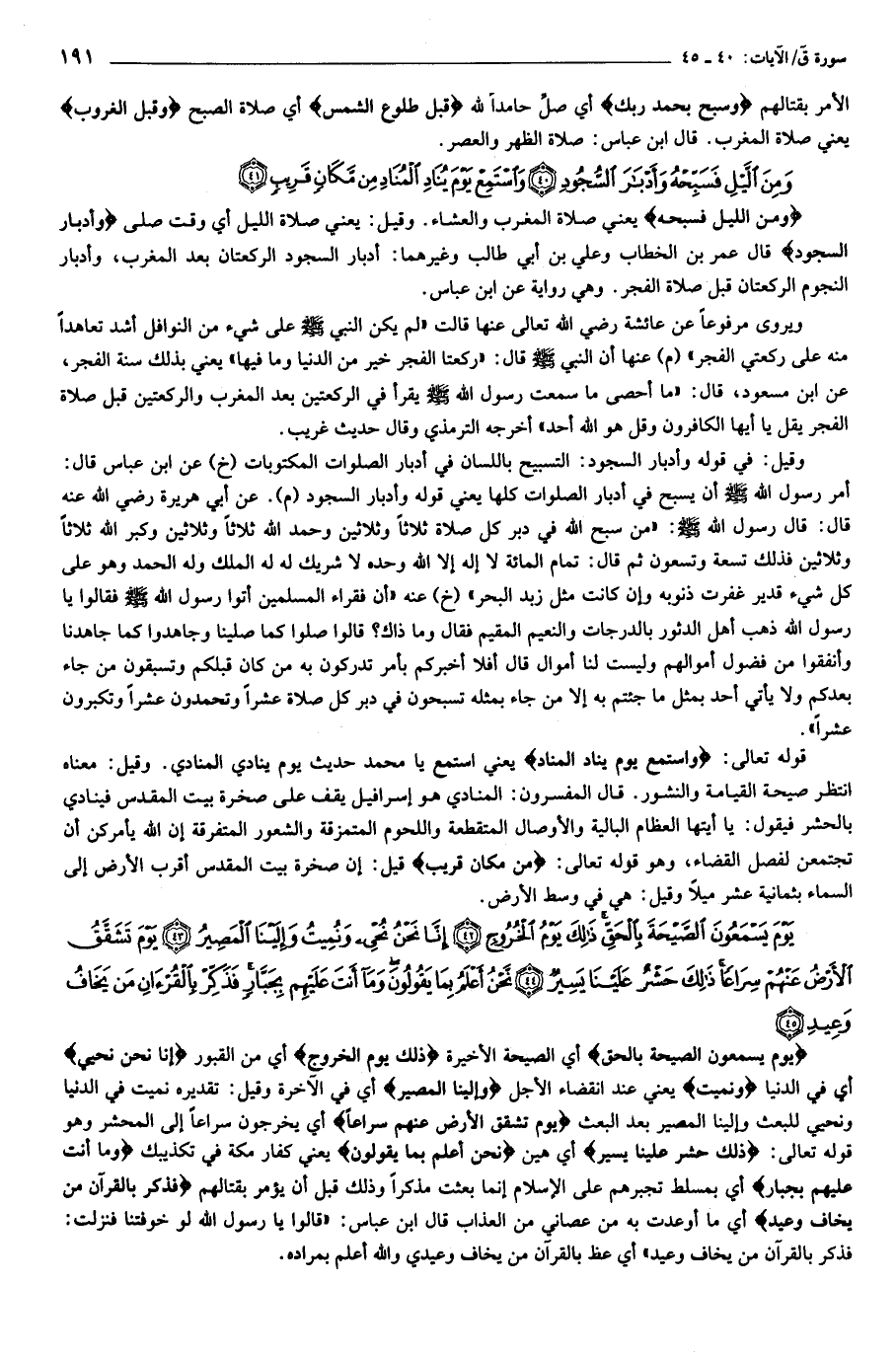وقيل: في قوله وأدبار السجود: التسبيح باللسان في أدبار الصلوات المكتوبات (خ) عن ابن عباس قال: