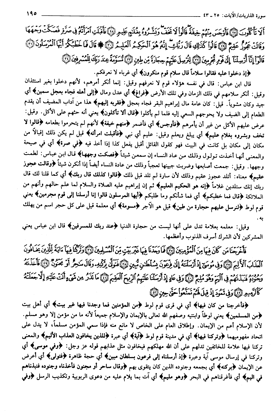 عرض عليهم الأكل من غير أن يأمرهم فَأَوْجَسَ أي فأضمر مِنْهُمْ خِيفَةً لأنهم لم يتحرموا بطعامه قالُوا لا تَخَفْ وَبَشَّرُوهُ بِغُلامٍ عَلِيمٍ أي يبلغ ويعلم وقيل: عليم أي نبي فَأَقْبَلَتِ امْرَأَتُهُ قيل لم يكن ذلك إقبالا من مكان إلى مكان بل كانت في البيت فهو كقول القائل أقبل يفعل كذا إذا أخذ فيه فِي صَرَّةٍ أي في صيحة والمعنى أنها أخذت تولول وذلك من عاد النساء إن سمعن شيئا فَصَكَّتْ وَجْهَها قال ابن عباس: لطمت وجهها. وقيل: جمعت أصابعها وضربت جبينها تعجبا وذلك من عادة النساء أيضا إذا أنكرن شيئا وَقالَتْ عَجُوزٌ عَقِيمٌ معناه: أتلد عجوز عقيم وذلك لأن سارة لم تلد قبل ذلك قالُوا كَذلِكَ قالَ رَبُّكِ أي كما قلنا لك قال ربك إنك ستلدين غلاما إِنَّهُ هُوَ الْحَكِيمُ الْعَلِيمُ ثم إن إبراهيم عليه الصلاة والسلام لما علم حالهم وأنهم من الملائكة قالَ فَما خَطْبُكُمْ أي فما شأنكم وما طلبكم أَيُّهَا الْمُرْسَلُونَ قالُوا إِنَّا أُرْسِلْنا إِلى قَوْمٍ مُجْرِمِينَ يعني قوم لوط لِنُرْسِلَ عَلَيْهِمْ حِجارَةً مِنْ طِينٍ قيل هو الآجر مُسَوَّمَةً أي معلمة قيل على كل حجر اسم من يهلك به.