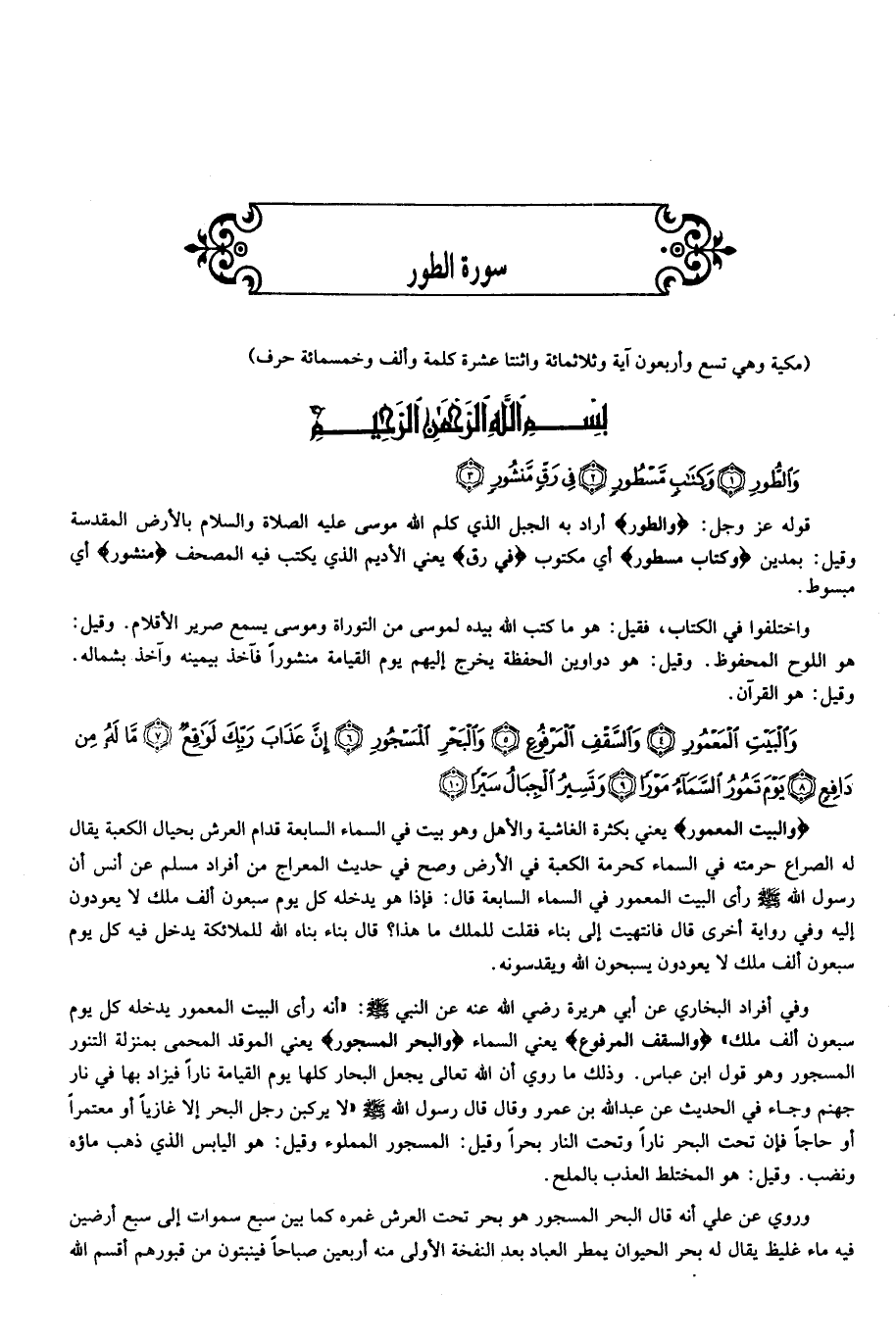 قوله عز وجل: وَالطُّورِ أراد به الجبل الذي كلم الله موسى عليه الصلاة والسلام بالأرض المقدسة وقيل: بمدين وَكِتابٍ مَسْطُورٍ أي مكتوب فِي رَقٍّ يعني الأديم الذي يكتب فيه المصحف مَنْشُورٍ أي مبسوط.