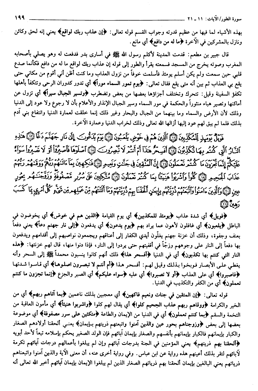 قوله تعالى: إِنَّ الْمُتَّقِينَ فِي جَنَّاتٍ وَنَعِيمٍ فاكِهِينَ أي معجبين بذلك ناعمين بِما آتاهُمْ رَبُّهُمْ أي من الخير والكرامة وَوَقاهُمْ رَبُّهُمْ عَذابَ الْجَحِيمِ كُلُوا أي يقال لهم كلوا وَاشْرَبُوا هَنِيئاً أي مأمون العاقبة من التخمة والسقم بِما كُنْتُمْ تَعْمَلُونَ أي في الدنيا من الإيمان والطاعة مُتَّكِئِينَ عَلى سُرُرٍ مَصْفُوفَةٍ أي موضوعة بعضها إلى بعض وَزَوَّجْناهُمْ بِحُورٍ عِينٍ وَالَّذِينَ آمَنُوا وَاتَّبَعَتْهُمْ ذُرِّيَّتُهُمْ بِإِيمانٍ يعني ألحقنا أولادهم الصغار والكبار بإيمانهم فالكبار بإيمانهم بأنفسهم والصغار بإيمان آبائهم فإن الولد الصغير يحكم بإسلامه تبعا لأحد أبويه أَلْحَقْنا بِهِمْ ذُرِّيَّتَهُمْ يعني المؤمنين في الجنة بدرجات آبائهم وإن لم يبلغوا بأعمالهم درجات آبائهم تكرمة لآبائهم لتقر بذلك أعينهم هذه رواية عن ابن عباس. وفي رواية أخرى عنه، أن معنى الآية والذين آمنوا واتبعناهم ذرياتهم يعني البالغين بإيمان ألحقنا بهم ذرياتهم الصغار الذين لم يبلغوا الإيمان بإيمان آبائهم أخبر الله تعالى أنه