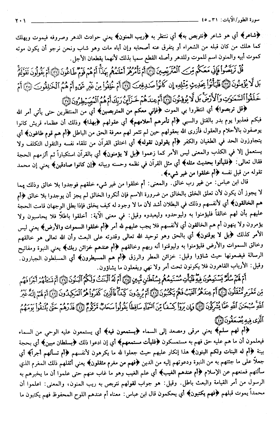 قُلْ تَرَبَّصُوا فَإِنِّي مَعَكُمْ مِنَ الْمُتَرَبِّصِينَ (31) أَمْ تَأْمُرُهُمْ أَحْلامُهُمْ بِهذا أَمْ هُمْ قَوْمٌ طاغُونَ (32) أَمْ يَقُولُونَ تَقَوَّلَهُ بَلْ لا يُؤْمِنُونَ (33) فَلْيَأْتُوا بِحَدِيثٍ مِثْلِهِ إِنْ كانُوا صادِقِينَ (34) أَمْ خُلِقُوا مِنْ غَيْرِ شَيْءٍ أَمْ هُمُ الْخالِقُونَ (35)