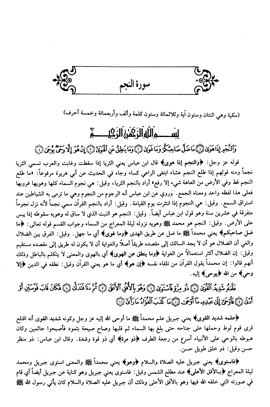 قوله عز وجل: وَالنَّجْمِ إِذا هَوى قال ابن عباس يعني الثريا إذا سقطت وغابت والعرب تسمي الثريا نجما ومنه قولهم إذا طلع النجم عشاء ابتغى الراعي كساء وجاء في الحديث عن أبي هريرة مرفوعا: «ما طلع النجم قط وفي الأرض من العاهة شيء إلا رفع» أراد بالنجم الثريا، وقيل: هي نجوم السماء كلها وهويها غروبها فعلى هذا لفظه واحد ومعناه الجمع. وروي عن ابن عباس أنه الرجوم من النجوم وهي ما ترمى به الشياطين عند استراق السمع. وقيل: هي النجوم إذا انتثرت يوم القيامة. وقيل: أراد بالنجم القرآن سمي نجما لأنه نزل نجوما متفرقة في عشرين سنة وهو قول ابن عباس أيضا. وقيل: النجم هو النبت الذي لا ساق له وهويه سقوطه إذا يبس على الأرض. وقيل: النجم هو محمد صلّى الله عليه وسلّم وهويه نزوله ليلة المعراج من السماء وجواب القسم قوله تعالى: ما ضَلَّ صاحِبُكُمْ يعني محمدا صلّى الله عليه وسلّم ما ضل عن طريق الهدى وَما غَوى أي ما جهل. وقيل: الفرق بين الضلال والغي أن الضلال هو أن لا يجد السالك إلى مقصده طريقا أصلا والغواية أن لا يكون له طريق إلى مقصده مستقيم وقيل: إن الضلال أكثر استعمالا من الغواية وَما يَنْطِقُ عَنِ الْهَوى أي بالهوى والمعنى لا يتكلم بالباطل وذلك أنهم قالوا: إن محمدا يقول القرآن من تلقاء نفسه إِنْ هُوَ أي ما هو يعني القرآن وقيل: نطقه في الدين إِلَّا وَحْيٌ من الله يُوحى إليه.