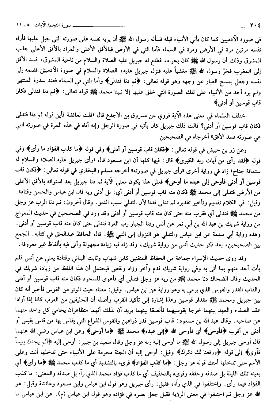وعن زر بن حبيش في قوله تعالى: فَكانَ قابَ قَوْسَيْنِ أَوْ أَدْنى وفي قوله ما كَذَبَ الْفُؤادُ ما رَأى وفي قوله لَقَدْ رَأى مِنْ آياتِ رَبِّهِ الْكُبْرى قال: فيها كلها أن ابن مسعود قال «رأى جبريل عليه الصلاة والسلام له ستمائة جناح» زاد في رواية أخرى «رأى جبريل في صورته» أخرجه مسلم والبخاري في قوله تعالى: فَكانَ قابَ قَوْسَيْنِ أَوْ أَدْنى فَأَوْحى إِلى عَبْدِهِ ما أَوْحى فعلى هذا يكون معنى الآية ثم دنا جبريل بعد استوائه بالأفق الأعلى من الأرض فتدلى إلى محمد صلّى الله عليه وسلّم فكان منه قاب قوسين أو أدنى أي: بل أدنى وبه قال ابن عباس والحسن وقتادة.