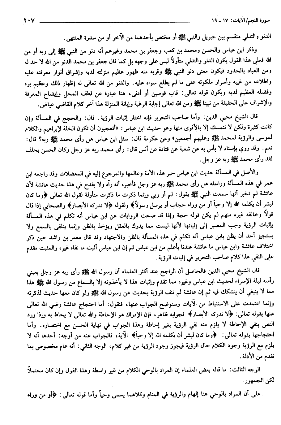 قال الشيخ محيي الدين فالحاصل أن الراجح عند أكثر العلماء أن رسول الله صلّى الله عليه وسلّم رأى ربه عز وجل بعيني رأسه ليلة الإسراء لحديث ابن عباس وغيره مما تقدم وإثبات هذا لا يأخذونه إلا بالسماع من رسول الله صلّى الله عليه وسلّم هذا مما لا ينبغي أن يتشكك فيه ثم إن عائشة لم تنف الرؤية بحديث عن رسول الله صلّى الله عليه وسلّم ولو كان معها حديث لذكرته وإنما اعتمدت على الاستنباط من الآيات وسنوضح الجواب عنها، فنقول: أما احتجاج عائشة رضي الله تعالى عنها بقوله تعالى: لا تُدْرِكُهُ الْأَبْصارُ فجوابه ظاهر، فإن الإدراك هو الإحاطة والله تعالى لا يحاط به وإذا ورد النص بنفي الإحاطة لا يلزم منه نفي الرؤية بغير إحاطة وهذا الجواب في نهاية الحسن مع اختصاره. وأما احتجاجها بقوله تعالى: وَما كانَ لِبَشَرٍ أَنْ يُكَلِّمَهُ اللَّهُ إِلَّا وَحْياً الآية، فالجواب عنه من أوجه: أحدها أنه لا يلزم مع الرؤية وجود الكلام حال الرؤية فيجوز وجود الرؤية من غير كلام، الوجه الثاني: أنه عام مخصوص بما تقدم من الأدلة.