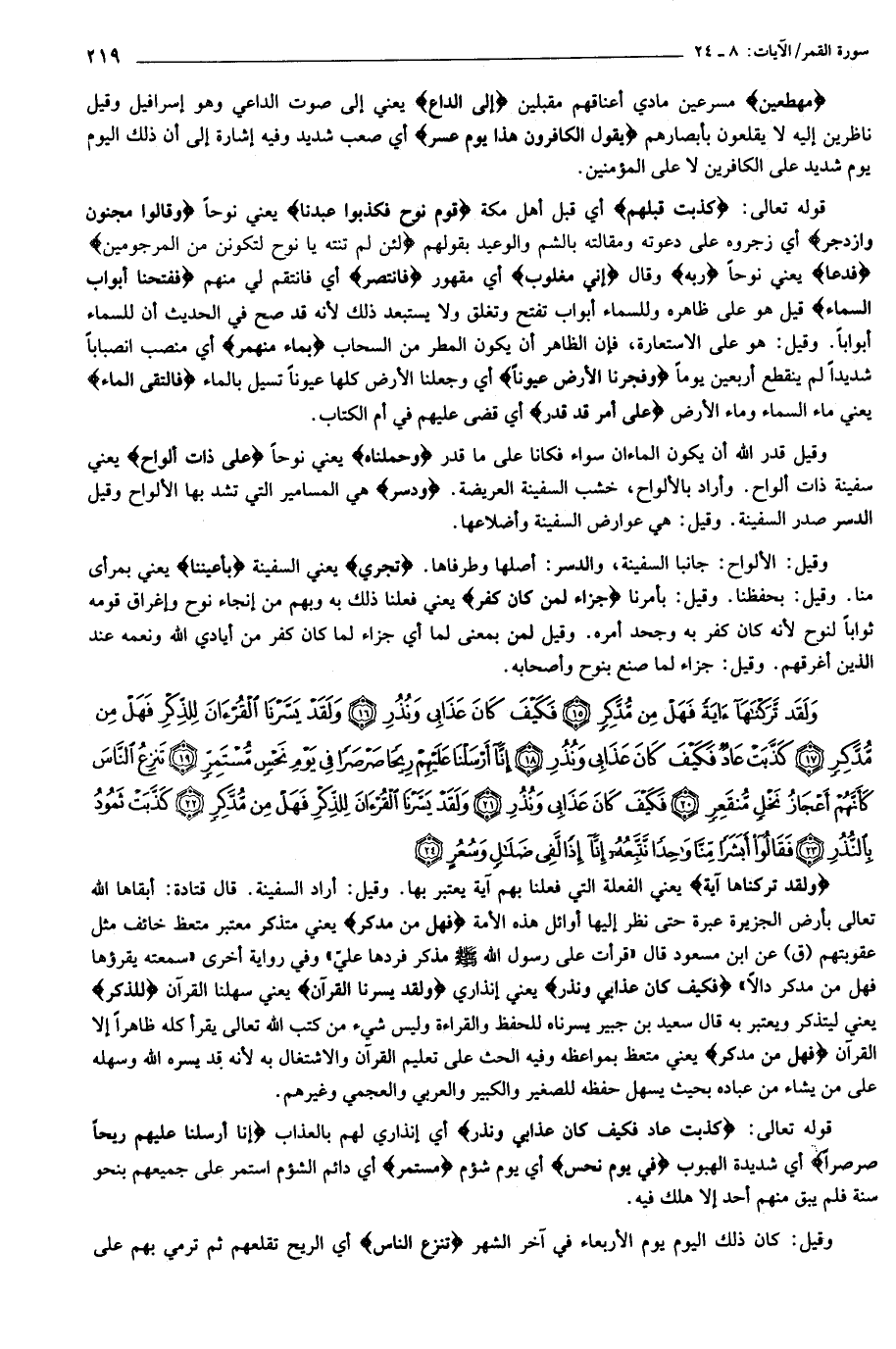 قوله تعالى: كَذَّبَتْ عادٌ فَكَيْفَ كانَ عَذابِي وَنُذُرِ أي إنذاري لهم بالعذاب إِنَّا أَرْسَلْنا عَلَيْهِمْ رِيحاً صَرْصَراً أي شديدة الهبوب فِي يَوْمِ نَحْسٍ أي يوم شؤم مُسْتَمِرٍّ أي دائم الشؤم استمر على جميعهم بنحو سنة فلم يبق منهم أحد إلا هلك فيه.