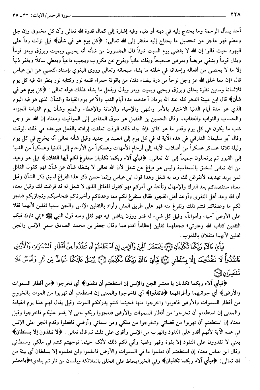 فَبِأَيِّ آلاءِ رَبِّكُما تُكَذِّبانِ (32) يا مَعْشَرَ الْجِنِّ وَالْإِنْسِ إِنِ اسْتَطَعْتُمْ أَنْ تَنْفُذُوا مِنْ أَقْطارِ السَّماواتِ وَالْأَرْضِ فَانْفُذُوا لا تَنْفُذُونَ إِلاَّ بِسُلْطانٍ (33) فَبِأَيِّ آلاءِ رَبِّكُما تُكَذِّبانِ (34) يُرْسَلُ عَلَيْكُما شُواظٌ مِنْ نارٍ وَنُحاسٌ فَلا تَنْتَصِرانِ (35)