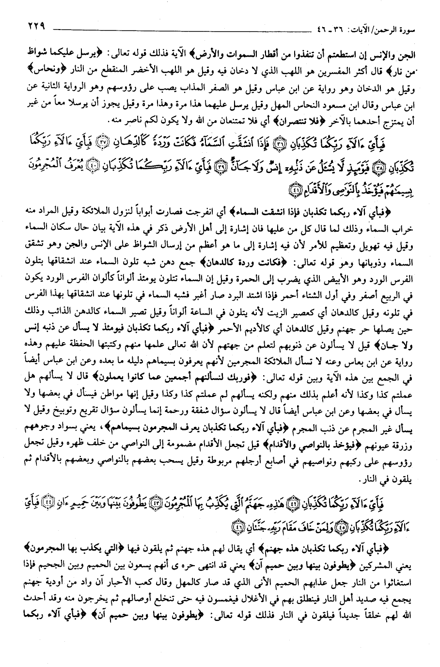 فَبِأَيِّ آلاءِ رَبِّكُما تُكَذِّبانِ (36) فَإِذَا انْشَقَّتِ السَّماءُ فَكانَتْ وَرْدَةً كَالدِّهانِ (37) فَبِأَيِّ آلاءِ رَبِّكُما تُكَذِّبانِ (38) فَيَوْمَئِذٍ لا يُسْئَلُ عَنْ ذَنْبِهِ إِنْسٌ وَلا جَانٌّ (39) فَبِأَيِّ آلاءِ رَبِّكُما تُكَذِّبانِ (40)
