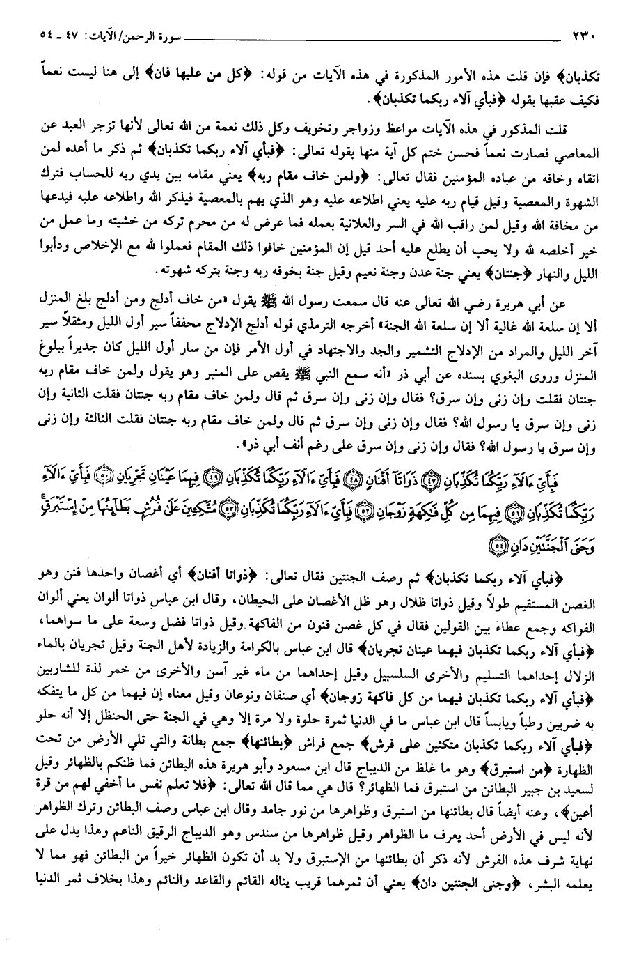 فَبِأَيِّ آلاءِ رَبِّكُما تُكَذِّبانِ ثم وصف الجنتين فقال تعالى: ذَواتا أَفْنانٍ أي أغصان واحدها فنن وهو الغصن المستقيم طولا وقيل ذواتا ظلال وهو ظل الأغصان على الحيطان، وقال ابن عباس ذواتا ألوان يعني ألوان الفواكه وجمع عطاء بين القولين فقال في كل غصن فنون من الفاكهة وقيل ذواتا فضل وسعة على ما سواهما، فَبِأَيِّ آلاءِ رَبِّكُما تُكَذِّبانِ فِيهِما عَيْنانِ تَجْرِيانِ قال ابن عباس بالكرامة والزيادة لأهل الجنة وقيل تجريان بالماء الزلال إحداهما التسليم والأخرى السلسبيل وقيل إحداهما من ماء غير آسن والأخرى من خمر لذة للشاربين فَبِأَيِّ آلاءِ رَبِّكُما تُكَذِّبانِ فِيهِما مِنْ كُلِّ فاكِهَةٍ زَوْجانِ أي صنفان ونوعان وقيل معناه إن فيهما من كل ما يتفكه به ضربين رطبا ويابسا قال ابن عباس ما في الدنيا ثمرة حلوة ولا مرة إلا وهي في الجنة حتى الحنظل إلا أنه حلو فَبِأَيِّ آلاءِ رَبِّكُما تُكَذِّبانِ مُتَّكِئِينَ عَلى فُرُشٍ جمع فراش بَطائِنُها جمع بطانة والتي تلي الأرض من تحت الظهارة مِنْ إِسْتَبْرَقٍ وهو ما غلظ من الديباج قال ابن مسعود وأبو هريرة هذه البطائن فما ظنكم بالظهائر وقيل لسعيد بن جبير البطائن من إستبرق فما الظهائر؟ قال هي مما قال الله تعالى: فَلا تَعْلَمُ نَفْسٌ ما أُخْفِيَ لَهُمْ مِنْ قُرَّةِ أَعْيُنٍ، وعنه أيضا قال بطائنها من إستبرق وظواهرها من نور جامد وقال ابن عباس وصف البطائن وترك الظواهر لأنه ليس في الأرض أحد يعرف ما الظواهر وقيل ظواهرها من سندس وهو الديباج الرقيق الناعم وهذا يدل على نهاية شرف هذه الفرش لأنه ذكر أن بطائنها من الإستبرق ولا بد أن تكون الظهائر خيرا من البطائن فهو مما لا يعلمه البشر، وَجَنَى الْجَنَّتَيْنِ دانٍ يعني أن ثمرهما قريب يناله القائم والقاعد والنائم وهذا بخلاف ثمر الدنيا