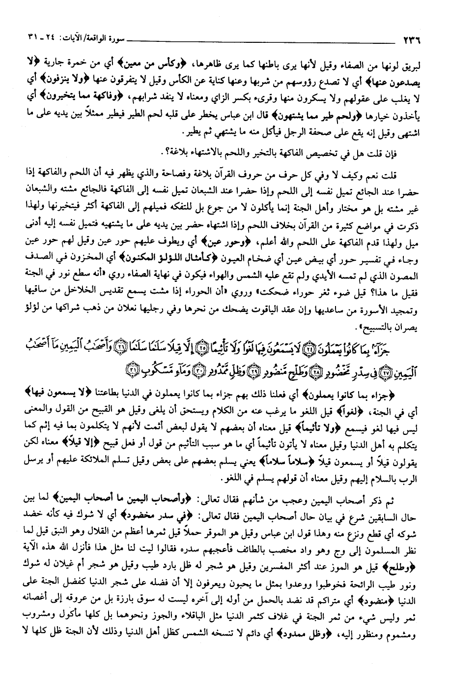 قلت نعم وكيف لا وفي كل حرف من حروف القرآن بلاغة وفصاحة والذي يظهر فيه أن اللحم والفاكهة إذا حضرا عند الجائع تميل نفسه إلى اللحم وإذا حضرا عند الشبعان تميل نفسه إلى الفاكهة فالجائع مشته والشبعان غير مشته بل هو مختار وأهل الجنة إنما يأكلون لا من جوع بل للتفكه فميلهم إلى الفاكهة أكثر فيتخيرنها ولهذا ذكرت في مواضع كثيرة من القرآن بخلاف اللحم وإذا اشتهاه حضر بين يديه على ما يشتهيه فتميل نفسه إليه أدنى ميل ولهذا قدم الفاكهة على اللحم والله أعلم، وَحُورٌ عِينٌ أي ويطوف عليهم حور عين وقيل لهم حور عين وجاء في تفسير حور أي بيض عين أي ضخام العيون كَأَمْثالِ اللُّؤْلُؤِ الْمَكْنُونِ أي المخزون في الصدف المصون الذي لم تمسه الأيدي ولم تقع عليه الشمس والهواء فيكون في نهاية الصفاء روي «أنه سطع نور في الجنة فقيل ما هذا؟ قيل ضوء ثغر حوراء ضحكت» وروي «أن الحوراء إذا مشت يسمع تقديس الخلاخل من ساقيها وتمجيد الأسورة من ساعديها وإن عقد الياقوت يضحك من نحرها وفي رجليها نعلان من ذهب شراكها من لؤلؤ يصران بالتسبيح».