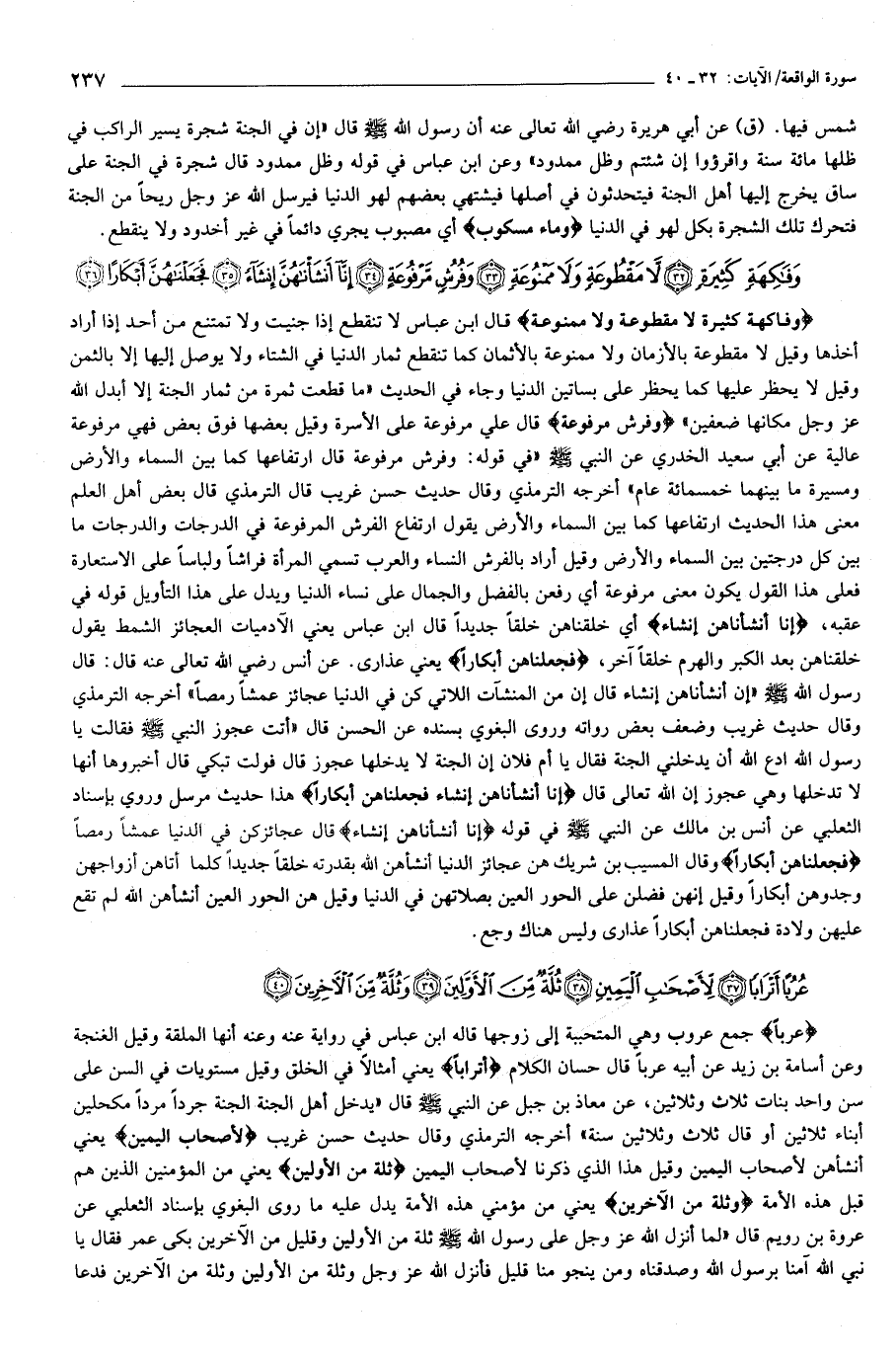 عُرُباً جمع عروب وهي المتحببة إلى زوجها قاله ابن عباس في رواية عنه وعنه أنها الملقة وقيل الغنجة وعن أسامة بن زيد عن أبيه عربا قال حسان الكلام أَتْراباً يعني أمثالا في الخلق وقيل مستويات في السن على سن واحد بنات ثلاث وثلاثين، عن معاذ بن جبل عن النبي صلّى الله عليه وسلّم قال «يدخل أهل الجنة الجنة جردا مردا مكحلين أبناء ثلاثين أو قال ثلاث وثلاثين سنة» أخرجه الترمذي وقال حديث حسن غريب لِأَصْحابِ الْيَمِينِ يعني أنشأهن لأصحاب اليمين وقيل هذا الذي ذكرنا لأصحاب اليمين ثُلَّةٌ مِنَ الْأَوَّلِينَ يعني من المؤمنين الذين هم قبل هذه الأمة وَثُلَّةٌ مِنَ الْآخِرِينَ يعني من مؤمني هذه الأمة يدل عليه ما روى البغوي بإسناد الثعلبي عن عروة بن رويم قال «لما أنزل الله عز وجل على رسول الله صلّى الله عليه وسلّم ثلة من الأولين وقليل من الآخرين بكى عمر فقال يا نبي الله آمنا برسول الله وصدقناه ومن ينجو منا قليل فأنزل الله عز وجل وثلة من الأولين وثلة من الآخرين فدعا