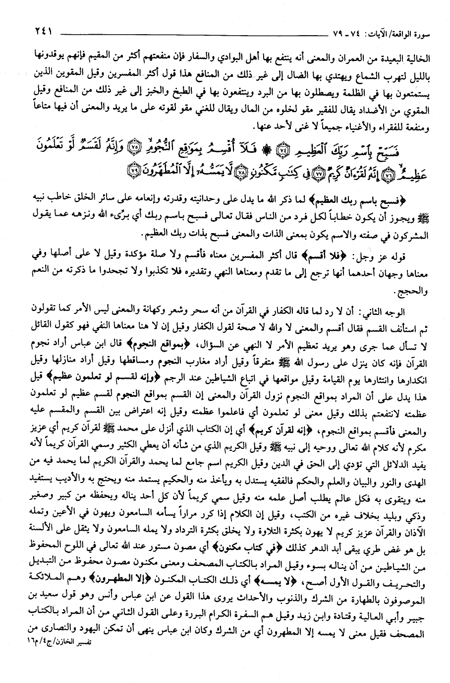 فَسَبِّحْ بِاسْمِ رَبِّكَ الْعَظِيمِ (74) فَلا أُقْسِمُ بِمَواقِعِ النُّجُومِ (75) وَإِنَّهُ لَقَسَمٌ لَوْ تَعْلَمُونَ عَظِيمٌ (76) إِنَّهُ لَقُرْآنٌ كَرِيمٌ (77) فِي كِتابٍ مَكْنُونٍ (78)