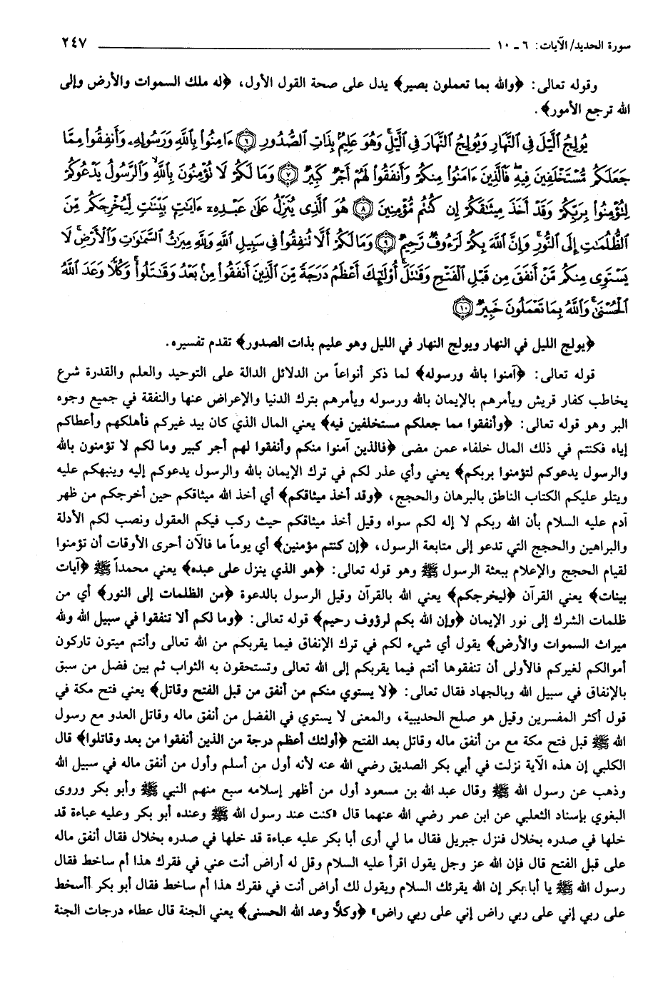 يُولِجُ اللَّيْلَ فِي النَّهارِ وَيُولِجُ النَّهارَ فِي اللَّيْلِ وَهُوَ عَلِيمٌ بِذاتِ الصُّدُورِ (6) آمِنُوا بِاللَّهِ وَرَسُولِهِ وَأَنْفِقُوا مِمَّا جَعَلَكُمْ مُسْتَخْلَفِينَ فِيهِ فَالَّذِينَ آمَنُوا مِنْكُمْ وَأَنْفَقُوا لَهُمْ أَجْرٌ كَبِيرٌ (7) وَما لَكُمْ لا تُؤْمِنُونَ بِاللَّهِ وَالرَّسُولُ يَدْعُوكُمْ لِتُؤْمِنُوا بِرَبِّكُمْ وَقَدْ أَخَذَ مِيثاقَكُمْ إِنْ كُنْتُمْ مُؤْمِنِينَ (8) هُوَ الَّذِي يُنَزِّلُ عَلى عَبْدِهِ آياتٍ بَيِّناتٍ لِيُخْرِجَكُمْ مِنَ الظُّلُماتِ إِلَى النُّورِ وَإِنَّ اللَّهَ بِكُمْ لَرَؤُفٌ رَحِيمٌ (9) وَما لَكُمْ أَلاَّ تُنْفِقُوا فِي سَبِيلِ اللَّهِ وَلِلَّهِ مِيراثُ السَّماواتِ وَالْأَرْضِ لا يَسْتَوِي مِنْكُمْ مَنْ أَنْفَقَ مِنْ قَبْلِ الْفَتْحِ وَقاتَلَ أُولئِكَ أَعْظَمُ دَرَجَةً مِنَ الَّذِينَ أَنْفَقُوا مِنْ بَعْدُ وَقاتَلُوا وَكُلاًّ وَعَدَ اللَّهُ الْحُسْنى وَاللَّهُ بِما تَعْمَلُونَ خَبِيرٌ (10)