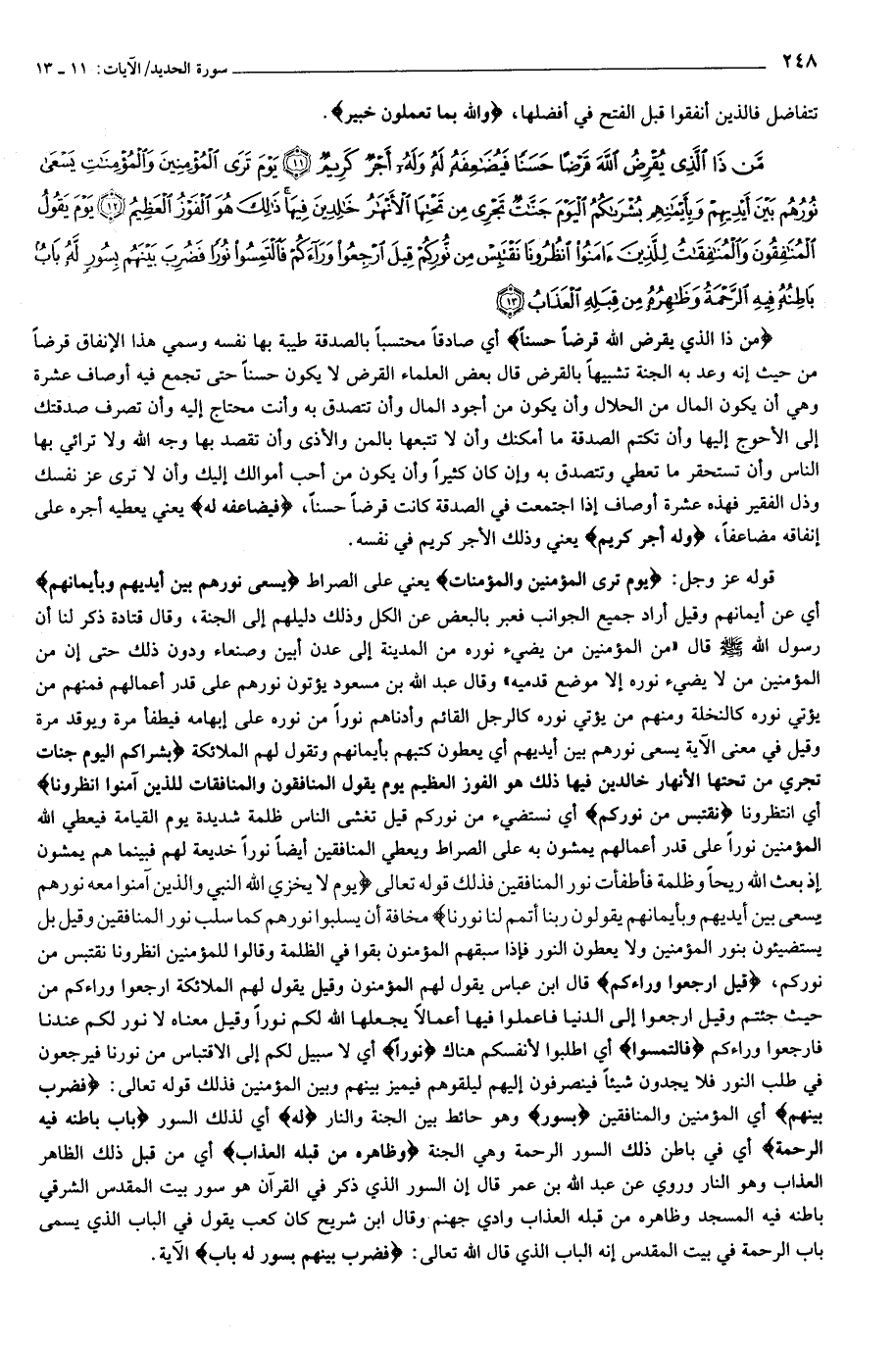 مَنْ ذَا الَّذِي يُقْرِضُ اللَّهَ قَرْضاً حَسَناً فَيُضاعِفَهُ لَهُ وَلَهُ أَجْرٌ كَرِيمٌ (11) يَوْمَ تَرَى الْمُؤْمِنِينَ وَالْمُؤْمِناتِ يَسْعى نُورُهُمْ بَيْنَ أَيْدِيهِمْ وَبِأَيْمانِهِمْ بُشْراكُمُ الْيَوْمَ جَنَّاتٌ تَجْرِي مِنْ تَحْتِهَا الْأَنْهارُ خالِدِينَ فِيها ذلِكَ هُوَ الْفَوْزُ الْعَظِيمُ (12) يَوْمَ يَقُولُ الْمُنافِقُونَ وَالْمُنافِقاتُ لِلَّذِينَ آمَنُوا انْظُرُونا نَقْتَبِسْ مِنْ نُورِكُمْ قِيلَ ارْجِعُوا وَراءَكُمْ فَالْتَمِسُوا نُوراً فَضُرِبَ بَيْنَهُمْ بِسُورٍ لَهُ بابٌ باطِنُهُ فِيهِ الرَّحْمَةُ وَظاهِرُهُ مِنْ قِبَلِهِ الْعَذابُ (13)