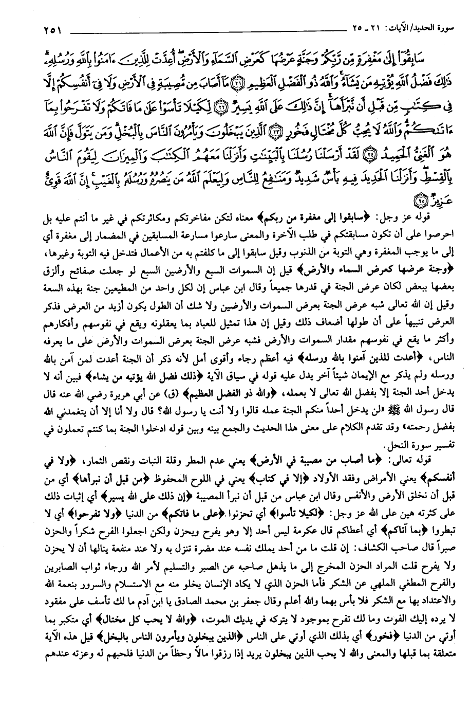 سابِقُوا إِلى مَغْفِرَةٍ مِنْ رَبِّكُمْ وَجَنَّةٍ عَرْضُها كَعَرْضِ السَّماءِ وَالْأَرْضِ أُعِدَّتْ لِلَّذِينَ آمَنُوا بِاللَّهِ وَرُسُلِهِ ذلِكَ فَضْلُ اللَّهِ يُؤْتِيهِ مَنْ يَشاءُ وَاللَّهُ ذُو الْفَضْلِ الْعَظِيمِ (21) ما أَصابَ مِنْ مُصِيبَةٍ فِي الْأَرْضِ وَلا فِي أَنْفُسِكُمْ إِلاَّ فِي كِتابٍ مِنْ قَبْلِ أَنْ نَبْرَأَها إِنَّ ذلِكَ عَلَى اللَّهِ يَسِيرٌ (22) لِكَيْلا تَأْسَوْا عَلى ما فاتَكُمْ وَلا تَفْرَحُوا بِما آتاكُمْ وَاللَّهُ لا يُحِبُّ كُلَّ مُخْتالٍ فَخُورٍ (23) الَّذِينَ يَبْخَلُونَ وَيَأْمُرُونَ النَّاسَ بِالْبُخْلِ وَمَنْ يَتَوَلَّ فَإِنَّ اللَّهَ هُوَ الْغَنِيُّ الْحَمِيدُ (24) لَقَدْ أَرْسَلْنا رُسُلَنا بِالْبَيِّناتِ وَأَنْزَلْنا مَعَهُمُ الْكِتابَ وَالْمِيزانَ لِيَقُومَ النَّاسُ بِالْقِسْطِ وَأَنْزَلْنَا الْحَدِيدَ فِيهِ بَأْسٌ شَدِيدٌ وَمَنافِعُ لِلنَّاسِ وَلِيَعْلَمَ اللَّهُ مَنْ يَنْصُرُهُ وَرُسُلَهُ بِالْغَيْبِ إِنَّ اللَّهَ قَوِيٌّ عَزِيزٌ (25)