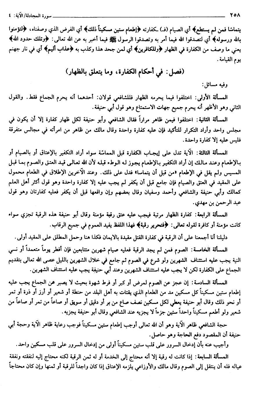 المسألة الثالثة: الآية تدل على إيجاب الكفارة قبل المماسّة سواء أراد التكفير بالإعتاق أو بالصيام أو بالإطعام وعند مالك إن أراد التكفير بالإطعام يجوز له الوطء قبله لأن الله تعالى قيد العتق والصوم بما قبل المسيس ولم يقل في الإطعام «من قبل أن يتماسا» فدل على ذلك. وعند الآخرين الإطلاق في الطعام محمول على المقيد في العتق والصيام فإن جامع قبل أن يكفر لم يجب عليه إلا كفارة واحدة وهو قول أكثر أهل العلم كمالك وأبي حنيفة والشافعي وأحمد وسفيان وقال بعضهم وإن واقعها قبل أن يكفر فعليه كفارتان وهو قول عبد الرّحمن بن مهدي.