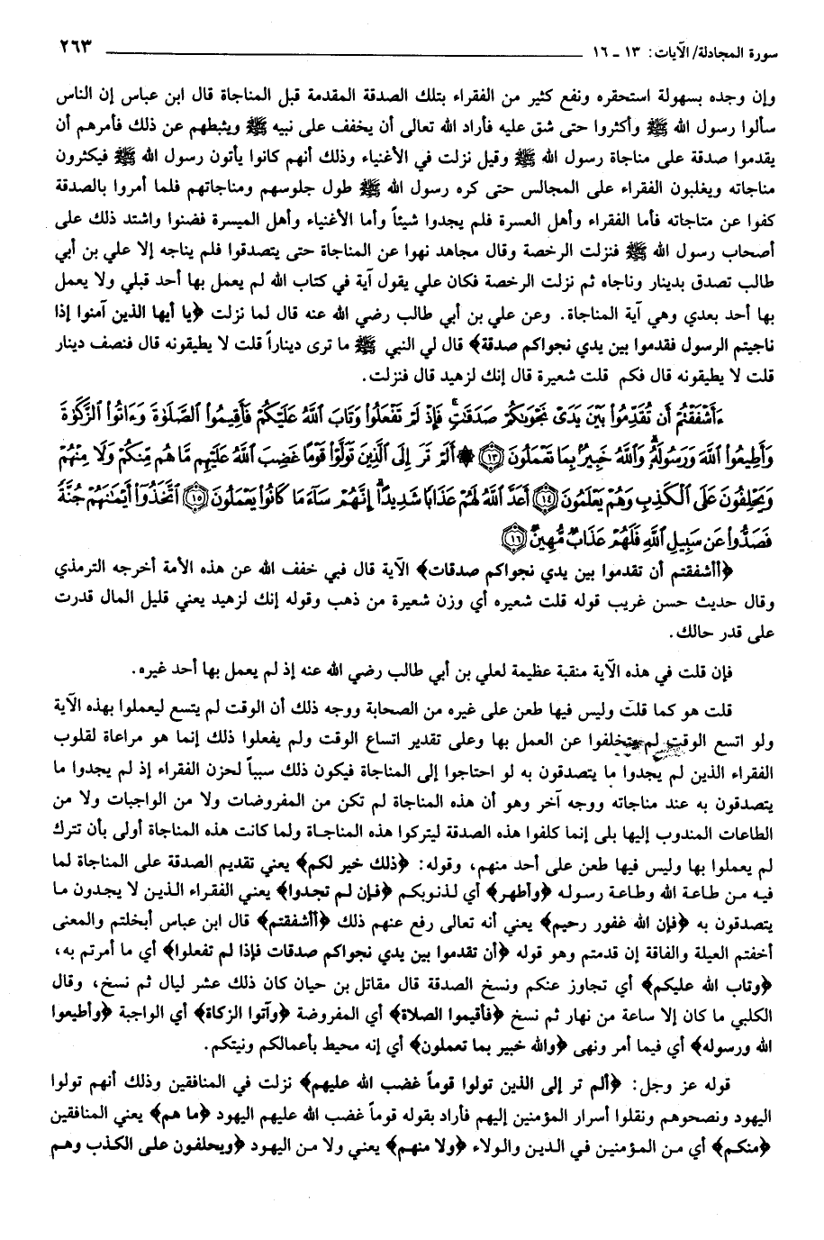 أَأَشْفَقْتُمْ أَنْ تُقَدِّمُوا بَيْنَ يَدَيْ نَجْواكُمْ صَدَقاتٍ فَإِذْ لَمْ تَفْعَلُوا وَتابَ اللَّهُ عَلَيْكُمْ فَأَقِيمُوا الصَّلاةَ وَآتُوا الزَّكاةَ وَأَطِيعُوا اللَّهَ وَرَسُولَهُ وَاللَّهُ خَبِيرٌ بِما تَعْمَلُونَ (13) أَلَمْ تَرَ إِلَى الَّذِينَ تَوَلَّوْا قَوْماً غَضِبَ اللَّهُ عَلَيْهِمْ ما هُمْ مِنْكُمْ وَلا مِنْهُمْ وَيَحْلِفُونَ عَلَى الْكَذِبِ وَهُمْ يَعْلَمُونَ (14) أَعَدَّ اللَّهُ لَهُمْ عَذاباً شَدِيداً إِنَّهُمْ ساءَ ما كانُوا يَعْمَلُونَ (15) اتَّخَذُوا أَيْمانَهُمْ جُنَّةً فَصَدُّوا عَنْ سَبِيلِ اللَّهِ فَلَهُمْ عَذابٌ مُهِينٌ (16)
