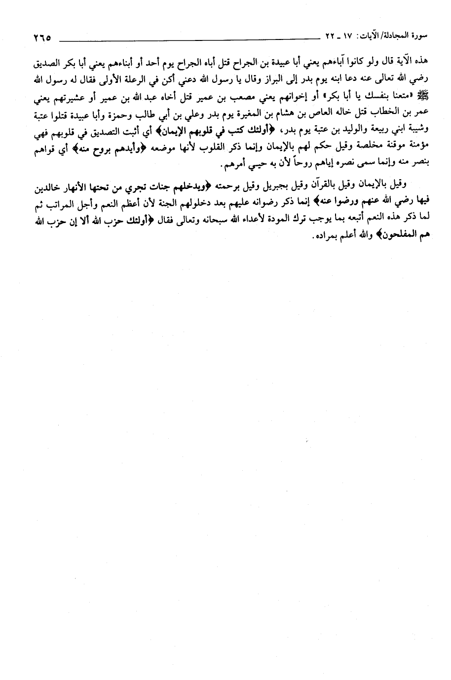 هذه الآية قال ولو كانوا آباءهم يعني أبا عبيدة بن الجراح قتل أباه الجراح يوم أحد أو أبناءهم يعني أبا بكر الصديق رضي الله تعالى عنه دعا ابنه يوم بدر إلى البراز وقال يا رسول الله دعني أكن في الرعلة الأولى فقال له رسول الله صلّى الله عليه وسلّم «متعنا بنفسك يا أبا بكر» أو إخوانهم يعني مصعب بن عمير قتل أخاه عبد الله بن عمير أو عشيرتهم يعني عمر بن الخطاب قتل خاله العاص بن هشام بن المغيرة يوم بدر وعلي بن أبي طالب وحمزة وأبا عبيدة قتلوا عتبة وشيبة ابني ربيعة والوليد بن عتبة يوم بدر، أُولئِكَ كَتَبَ فِي قُلُوبِهِمُ الْإِيمانَ أي أثبت التصديق في قلوبهم فهي مؤمنة موقنة مخلصة وقيل حكم لهم بالإيمان وإنما ذكر القلوب لأنها موضعه وَأَيَّدَهُمْ بِرُوحٍ مِنْهُ أي قواهم بنصر منه وإنما سمى نصره إياهم روحا لأن به حيي أمرهم.