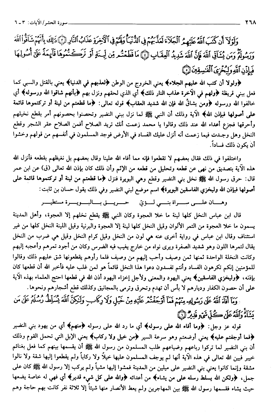 وَلَوْلا أَنْ كَتَبَ اللَّهُ عَلَيْهِمُ الْجَلاءَ يعني الخروج من الوطن لَعَذَّبَهُمْ فِي الدُّنْيا يعني بالقتل والسبي كما فعل ببني قريظة وَلَهُمْ فِي الْآخِرَةِ عَذابُ النَّارِ ذلِكَ أي الذي لحقهم ونزل بهم بِأَنَّهُمْ شَاقُّوا اللَّهَ وَرَسُولَهُ أي خالفوا الله ورسوله وَمَنْ يُشَاقِّ اللَّهَ فَإِنَّ اللَّهَ شَدِيدُ الْعِقابِ قوله تعالى: ما قَطَعْتُمْ مِنْ لِينَةٍ أَوْ تَرَكْتُمُوها قائِمَةً عَلى أُصُولِها فَبِإِذْنِ اللَّهِ الآية وذلك أن النبي صلّى الله عليه وسلّم لما نزل ببني النضير وتحصنوا بحصونهم أمر بقطع نخيلهم وأحرقها فجزع أعداء الله عند ذلك وقالوا يا محمد زعمت أنك تريد الصلاح أفمن الصلاح عقر الشجر وقطع النخل وهل وجدت فيما زعمت أنه أنزل عليك الفساد في الأرض فوجد المسلمون في أنفسهم من قولهم وخشوا أن يكون ذلك فسادا.