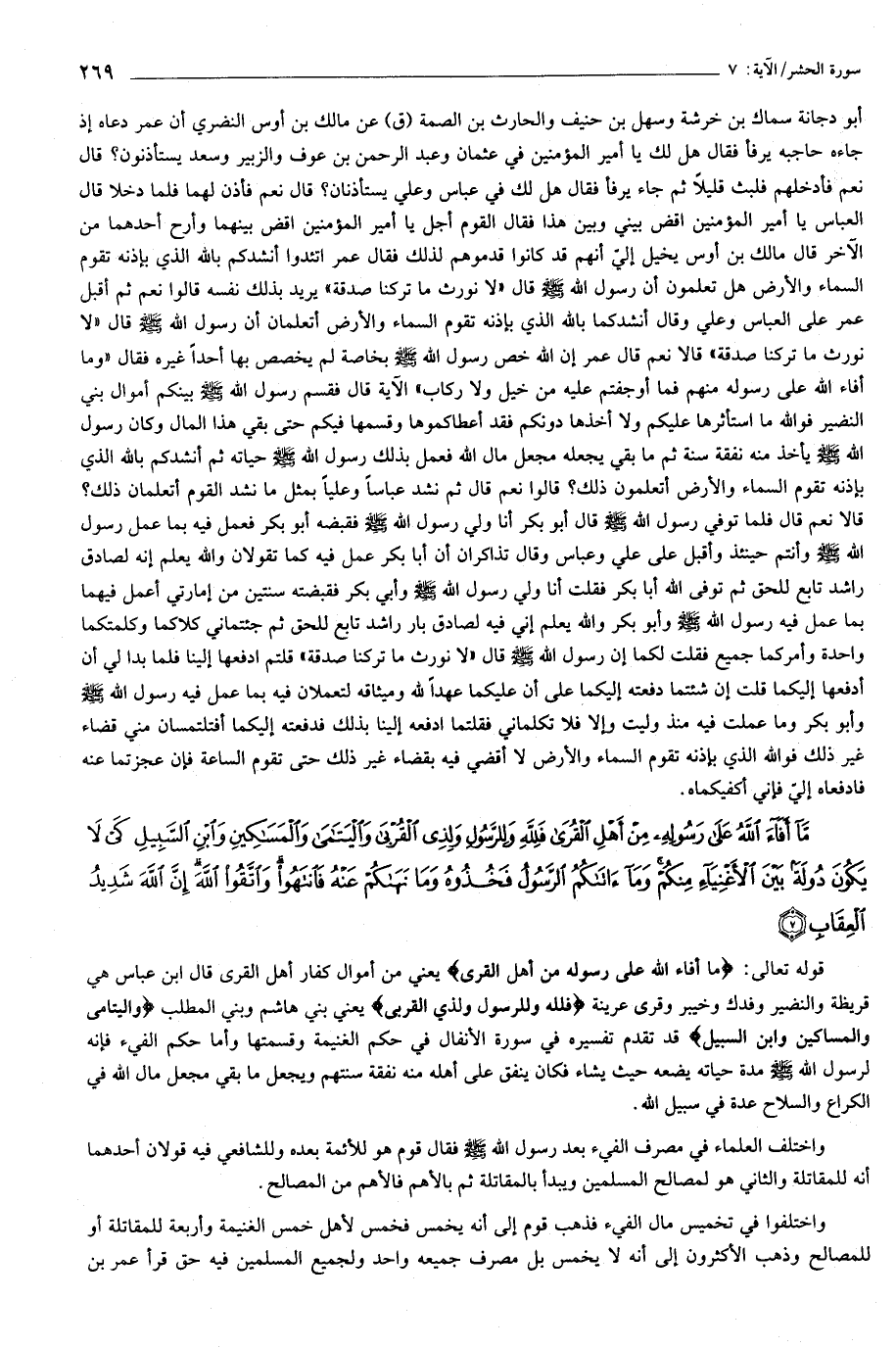 ما أَفاءَ اللَّهُ عَلى رَسُولِهِ مِنْ أَهْلِ الْقُرى فَلِلَّهِ وَلِلرَّسُولِ وَلِذِي الْقُرْبى وَالْيَتامى وَالْمَساكِينِ وَابْنِ السَّبِيلِ كَيْ لا يَكُونَ دُولَةً بَيْنَ الْأَغْنِياءِ مِنْكُمْ وَما آتاكُمُ الرَّسُولُ فَخُذُوهُ وَما نَهاكُمْ عَنْهُ فَانْتَهُوا وَاتَّقُوا اللَّهَ إِنَّ اللَّهَ شَدِيدُ الْعِقابِ (7)