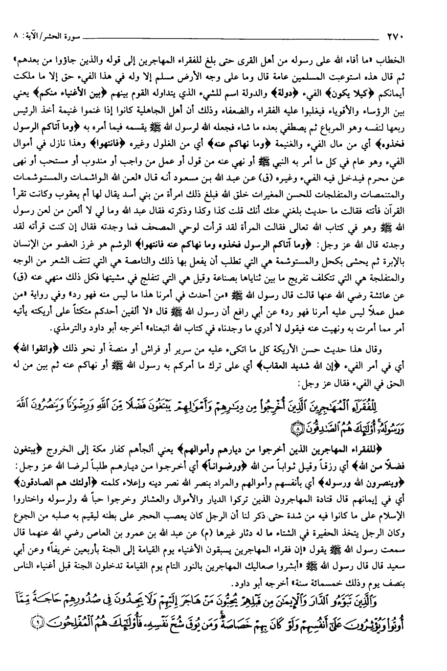 الخطاب «ما أفاء الله على رسوله من أهل القرى حتى بلغ للفقراء المهاجرين إلى قوله والذين جاءوا من بعدهم» ثم قال هذه استوعبت المسلمين عامة قال وما على وجه الأرض مسلم إلا وله في هذا الفيء حق إلا ما ملكت أيمانكم كَيْ لا يَكُونَ الفيء دُولَةً والدولة اسم للشيء الذي يتداوله القوم بينهم بَيْنَ الْأَغْنِياءِ مِنْكُمْ يعني بين الرؤساء والأقوياء فيغلبوا عليه الفقراء والضعفاء وذلك أن أهل الجاهلية كانوا إذا غنموا غنيمة أخذ الرئيس ربعها لنفسه وهو المرباع ثم يصطفي بعده ما شاء فجعله الله لرسول الله صلّى الله عليه وسلّم يقسمه فيما أمره به وَما آتاكُمُ الرَّسُولُ فَخُذُوهُ أي من مال الفيء والغنيمة وَما نَهاكُمْ عَنْهُ أي من الغلول وغيره فَانْتَهُوا وهذا نازل في أموال الفيء وهو عام في كل ما أمر به النبي صلّى الله عليه وسلّم أو نهي عنه من قول أو عمل من واجب أو مندوب أو مستحب أو نهى عن محرم فيدخل فيه الفيء وغيره (ق) عن عبد الله بن مسعود أنه قال «لعن الله الواشمات والمستوشمات والمتنمصات والمتفلجات للحسن المغيرات خلق الله فبلغ ذلك امرأة من بني أسد يقال لها أم يعقوب وكانت تقرأ القرآن فأتته فقالت ما حديث بلغني عنك أنك قلت كذا وكذا وذكرته فقال عبد الله وما لي لا ألعن من لعن رسول الله صلّى الله عليه وسلّم وهو في كتاب الله تعالى فقالت المرأة لقد قرأت لوحي المصحف فما وجدته فقال إن كنت قرأته لقد وجدته قال الله عز وجل: وَما آتاكُمُ الرَّسُولُ فَخُذُوهُ وَما نَهاكُمْ عَنْهُ فَانْتَهُوا الوشم هو غرز العضو من الإنسان بالإبرة ثم يحشى بكحل والمستوشمة هي التي تطلب أن يفعل بها ذلك والنامصة هي التي تنتف الشعر من الوجه والمتفلجة هي التي تتكلف تفريج ما بين ثناياها بصناعة وقيل هي التي تتفلج في مشيتها فكل ذلك منهي عنه (ق) عن عائشة رضي الله عنها قالت قال رسول الله صلّى الله عليه وسلّم «من أحدث في أمرنا هذا ما ليس منه فهو رد» وفي رواية «من عمل عملا ليس عليه أمرنا فهو رد» عن أبي رافع أن رسول الله صلّى الله عليه وسلّم قال «لا ألفين أحدكم متكئا على أريكته يأتيه أمر مما أمرت به ونهيت عنه فيقول لا أدري ما وجدناه في كتاب الله اتبعناه» أخرجه أبو داود والترمذي.