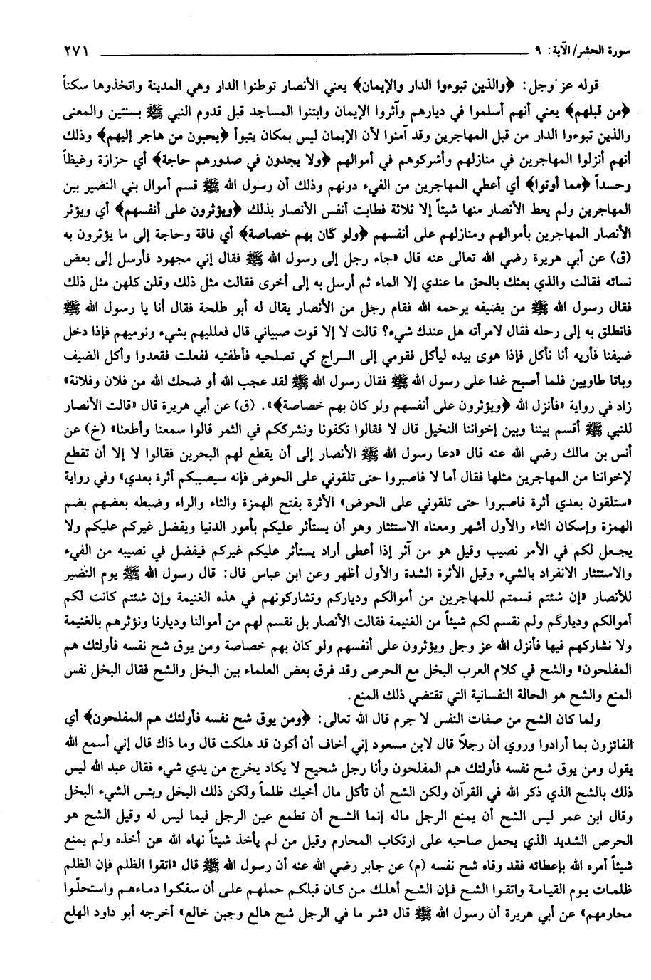 قوله عز وجل: وَالَّذِينَ تَبَوَّؤُا الدَّارَ وَالْإِيمانَ يعني الأنصار توطنوا الدار وهي المدينة واتخذوها سكنا مِنْ قَبْلِهِمْ يعني أنهم أسلموا في ديارهم وآثروا الإيمان وابتنوا المساجد قبل قدوم النبي صلّى الله عليه وسلّم بسنتين والمعنى والذين تبوءوا الدار من قبل المهاجرين وقد آمنوا لأن الإيمان ليس بمكان يتبوأ يُحِبُّونَ مَنْ هاجَرَ إِلَيْهِمْ وذلك أنهم أنزلوا المهاجرين في منازلهم وأشركوهم في أموالهم وَلا يَجِدُونَ فِي صُدُورِهِمْ حاجَةً أي حزازة وغيظا وحسدا مِمَّا أُوتُوا أي أعطي المهاجرين من الفيء دونهم وذلك أن رسول الله صلّى الله عليه وسلّم قسم أموال بني النضير بين المهاجرين ولم يعط الأنصار منها شيئا إلا ثلاثة فطابت أنفس الأنصار بذلك وَيُؤْثِرُونَ عَلى أَنْفُسِهِمْ أي ويؤثر الأنصار المهاجرين بأموالهم ومنازلهم على أنفسهم وَلَوْ كانَ بِهِمْ خَصاصَةٌ أي فاقة وحاجة إلى ما يؤثرون به (ق) عن أبي هريرة رضي الله تعالى عنه قال «جاء رجل إلى رسول الله صلّى الله عليه وسلّم فقال إني مجهود فأرسل إلى بعض نسائه فقالت والذي بعثك بالحق ما عندي إلا الماء ثم أرسل به إلى أخرى فقالت مثل ذلك وقلن كلهن مثل ذلك فقال رسول الله صلّى الله عليه وسلّم من يضيفه يرحمه الله فقام رجل من الأنصار يقال له أبو طلحة فقال أنا يا رسول الله صلّى الله عليه وسلّم فانطلق به إلى رحله فقال لامرأته هل عندك شيء؟ قالت لا إلا قوت صبياني قال فعلليهم بشيء ونوميهم فإذا دخل ضيفنا فأريه أنا نأكل فإذا هوى بيده ليأكل فقومي إلى السراج كي تصلحيه فأطفئيه ففعلت فقعدوا وأكل الضيف وباتا طاويين فلما أصبح غدا على رسول الله صلّى الله عليه وسلّم فقال رسول الله صلّى الله عليه وسلّم لقد عجب الله أو ضحك الله من فلان وفلانة» زاد في رواية «فأنزل الله وَيُؤْثِرُونَ عَلى أَنْفُسِهِمْ وَلَوْ كانَ بِهِمْ خَصاصَةٌ». (ق) عن أبي هريرة قال «قالت الأنصار للنبي صلّى الله عليه وسلّم أقسم بيننا وبين إخواننا النخيل قال لا فقالوا تكفونا ونشرككم في الثمر قالوا سمعنا وأطعنا» (خ) عن أنس بن مالك رضي الله عنه قال «دعا رسول الله صلّى الله عليه وسلّم الأنصار إلى أن يقطع لهم البحرين فقالوا لا إلا أن تقطع لإخواننا من المهاجرين مثلها فقال أما لا فاصبروا حتى تلقوني على الحوض فإنه سيصيبكم أثرة بعدي» وفي رواية «ستلقون بعدي أثرة فاصبروا حتى تلقوني على الحوض» الأثرة بفتح الهمزة والثاء والراء وضبطه بعضهم بضم الهمزة وإسكان الثاء والأول أشهر ومعناه الاستئثار وهو أن يستأثر عليكم بأمور الدنيا ويفضل غيركم عليكم ولا يجعل لكم في الأمر نصيب وقيل هو من آثر إذا أعطى أراد يستأثر عليكم غيركم فيفضل في نصيبه من الفيء والاستئثار الانفراد بالشيء وقيل الأثرة الشدة والأول أظهر وعن ابن عباس قال: قال رسول الله صلّى الله عليه وسلّم يوم النضير للأنصار «إن شئتم قسمتم للمهاجرين من أموالكم ودياركم وتشاركونهم في هذه الغنيمة وإن شئتم كانت لكم أموالكم ودياركم ولم نقسم لكم شيئا من الغنيمة فقالت الأنصار بل نقسم لهم من أموالنا وديارنا ونؤثرهم بالغنيمة ولا نشاركهم فيها فأنزل الله عز وجل ويؤثرون على أنفسهم ولو كان بهم خصاصة ومن يوق شح نفسه فأولئك هم المفلحون» والشح في كلام العرب البخل مع الحرص وقد فرق بعض العلماء بين البخل والشح فقال البخل نفس المنع والشح هو الحالة النفسانية التي تقتضي ذلك المنع.