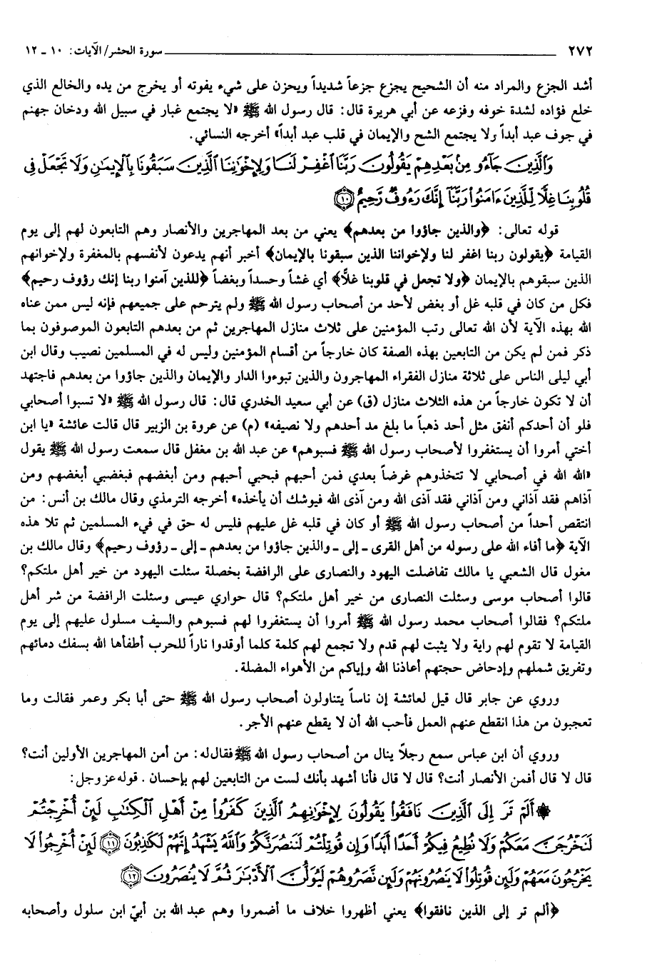 قوله تعالى: وَالَّذِينَ جاؤُ مِنْ بَعْدِهِمْ يعني من بعد المهاجرين والأنصار وهم التابعون لهم إلى يوم القيامة يَقُولُونَ رَبَّنَا اغْفِرْ لَنا وَلِإِخْوانِنَا الَّذِينَ سَبَقُونا بِالْإِيمانِ أخبر أنهم يدعون لأنفسهم بالمغفرة ولإخوانهم الذين سبقوهم بالإيمان وَلا تَجْعَلْ فِي قُلُوبِنا غِلًّا أي غشا وحسدا وبغضا لِلَّذِينَ آمَنُوا رَبَّنا إِنَّكَ رَؤُفٌ رَحِيمٌ فكل من كان في قلبه غل أو بغض لأحد من أصحاب رسول الله صلّى الله عليه وسلّم ولم يترحم على جميعهم فإنه ليس ممن عناه الله بهذه الآية لأن الله تعالى رتب المؤمنين على ثلاث منازل المهاجرين ثم من بعدهم التابعون الموصوفون بما ذكر فمن لم يكن من التابعين بهذه الصفة كان خارجا من أقسام المؤمنين وليس له في المسلمين نصيب وقال ابن أبي ليلى الناس على ثلاثة منازل الفقراء المهاجرون والذين تبوءوا الدار والإيمان والذين جاءوا من بعدهم فاجتهد أن لا تكون خارجا من هذه الثلاث منازل (ق) عن أبي سعيد الخدري قال: قال رسول الله صلّى الله عليه وسلّم «لا تسبوا أصحابي فلو أن أحدكم أنفق مثل أحد ذهبا ما بلغ مد أحدهم ولا نصيفه» (م) عن عروة بن الزبير قال قالت عائشة «يا ابن أختي أمروا أن يستغفروا لأصحاب رسول الله صلّى الله عليه وسلّم فسبوهم» عن عبد الله بن مغفل قال سمعت رسول الله صلّى الله عليه وسلّم يقول «الله الله في أصحابي لا تتخذوهم غرضا بعدي فمن أحبهم فبحبي أحبهم ومن أبغضهم فبغضبي أبغضهم ومن آذاهم فقد آذاني ومن آذاني فقد آذى الله ومن آذى الله فيوشك أن يأخذه» أخرجه الترمذي وقال مالك بن أنس: من انتقص أحدا من أصحاب رسول الله صلّى الله عليه وسلّم أو كان في قلبه غل عليهم فليس له حق في فيء المسلمين ثم تلا هذه الآية ما أَفاءَ اللَّهُ عَلى رَسُولِهِ مِنْ أَهْلِ الْقُرى - إلى- وَالَّذِينَ جاؤُ مِنْ بَعْدِهِمْ- إلى- رَؤُفٌ رَحِيمٌ وقال مالك بن مغول قال الشعبي يا مالك تفاضلت اليهود والنصارى على الرافضة بخصلة سئلت اليهود من خير أهل ملتكم؟