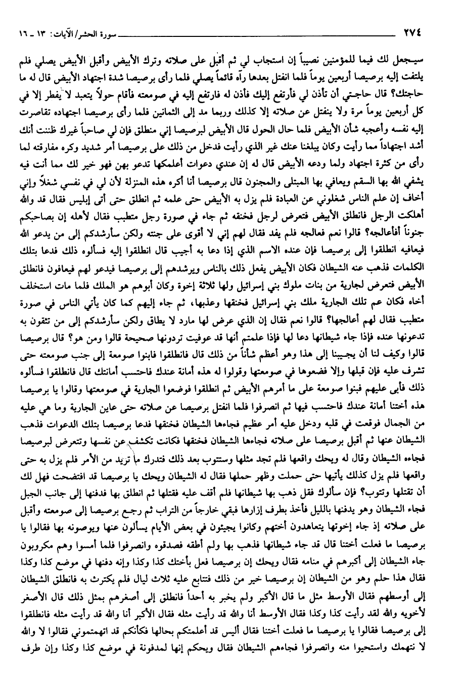 عنه الشيطان فكان الأبيض يفعل ذلك بالناس ويرشدهم إلى برصيصا فيدعو لهم فيعافون فانطلق الأبيض فتعرض لجارية من بنات ملوك بني إسرائيل ولها ثلاثة إخوة وكان أبوهم هو الملك فلما مات استخلف أخاه فكان عم تلك الجارية ملك بني إسرائيل فخنقها وعذبها، ثم جاء إليهم كما كان يأتي الناس في صورة متطبب فقال لهم أعالجها؟ قالوا نعم فقال إن الذي عرض لها مارد لا يطاق ولكن سأرشدكم إلى من تثقون به تدعونها عنده فإذا جاء شيطانها دعا لها فإذا علمتم أنها قد عوفيت تردونها صحيحة قالوا ومن هو؟ قال برصيصا قالوا وكيف لنا أن يجيبنا إلى هذا وهو أعظم شأنا من ذلك قال فانطلقوا فابنوا صومعة إلى جنب صومعته حتى تشرف عليه فإن قبلها وإلا فضعوها في صومعتها وقولوا له هذه أمانة عندك فاحتسب أمانتك قال فانطلقوا فسألوه ذلك فأبى عليهم فبنوا صومعة على ما أمرهم الأبيض ثم انطلقوا فوضعوا الجارية في صومعتها وقالوا يا برصيصا هذه أختنا أمانة عندك فاحتسب فيها ثم انصرفوا فلما انفتل برصيصا عن صلاته حتى عاين الجارية وما هي عليه من الجمال فوقعت في قلبه ودخل عليه أمر عظيم فجاءها الشيطان فخنقها فدعا برصيصا بتلك الدعوات فذهب الشيطان عنها ثم أقبل برصيصا على صلاته فجاءها الشيطان فخنقها فكانت تكشف عن نفسها وتتعرض لبرصيصا فجاءه الشيطان وقال له ويحك واقعها فلم تجد مثلها وستتوب بعد ذلك فتدرك ما تريد من الأمر فلم يزل به حتى واقعها فلم يزل كذلك يأتيها حتى حملت وظهر حملها فقال له الشيطان ويحك يا برصيصا قد افتضحت فهل لك أن تقتلها وتتوب؟ فإن سألوك فقل ذهب بها شيطانها فلم أقف عليه فقتلها ثم انطلق بها فدفنها إلى جانب الجبل فجاء الشيطان وهو يدفنها بالليل فأخذ بطرف إزارها فبقي خارجا من التراب ثم رجع برصيصا إلى صومعته وأقبل على صلاته إذ جاء إخوتها يتعاهدون أختهم وكانوا يجيئون في بعض الأيام يسألون عنها ويوصونه بها فقالوا يا برصيصا ما فعلت أختنا قال قد جاء شيطانها فذهب بها ولم أطقه فصدقوه وانصرفوا فلما أمسوا وهم مكروبون جاء الشيطان إلى أكبرهم في منامه فقال ويحك إن برصيصا فعل بأختك كذا وكذا وإنه دفنها في موضع كذا وكذا فقال هذا حلم وهو من الشيطان إن برصيصا خير من ذلك فتتابع عليه ثلاث ليال فلم يكترث به فانطلق الشيطان إلى أوسطهم فقال الأوسط مثل ما قال الأكبر ولم يخبر به أحدا فانطلق إلى أصغرهم بمثل ذلك قال الأصغر لأخويه والله لقد رأيت كذا وكذا فقال الأوسط أنا والله قد رأيت مثله فقال الأكبر أنا والله قد رأيت مثله فانطلقوا إلى برصيصا فقالوا يا برصيصا ما فعلت أختنا فقال أليس قد أعلمتكم بحالها فكأنكم قد اتهمتموني فقالوا لا والله لا نتهمك واستحيوا منه وانصرفوا فجاءهم الشيطان فقال ويحكم إنها لمدفونة في موضع كذا وكذا وإن طرف