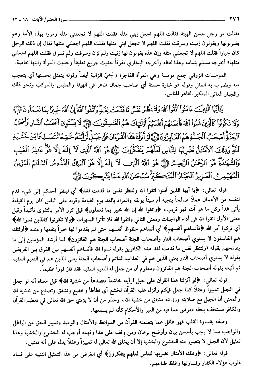 يا أَيُّهَا الَّذِينَ آمَنُوا اتَّقُوا اللَّهَ وَلْتَنْظُرْ نَفْسٌ ما قَدَّمَتْ لِغَدٍ وَاتَّقُوا اللَّهَ إِنَّ اللَّهَ خَبِيرٌ بِما تَعْمَلُونَ (18) وَلا تَكُونُوا كَالَّذِينَ نَسُوا اللَّهَ فَأَنْساهُمْ أَنْفُسَهُمْ أُولئِكَ هُمُ الْفاسِقُونَ (19) لا يَسْتَوِي أَصْحابُ النَّارِ وَأَصْحابُ الْجَنَّةِ أَصْحابُ الْجَنَّةِ هُمُ الْفائِزُونَ (20) لَوْ أَنْزَلْنا هذَا الْقُرْآنَ عَلى جَبَلٍ لَرَأَيْتَهُ خاشِعاً مُتَصَدِّعاً مِنْ خَشْيَةِ اللَّهِ وَتِلْكَ الْأَمْثالُ نَضْرِبُها لِلنَّاسِ لَعَلَّهُمْ يَتَفَكَّرُونَ (21) هُوَ اللَّهُ الَّذِي لا إِلهَ إِلاَّ هُوَ عالِمُ الْغَيْبِ وَالشَّهادَةِ هُوَ الرَّحْمنُ الرَّحِيمُ (22)