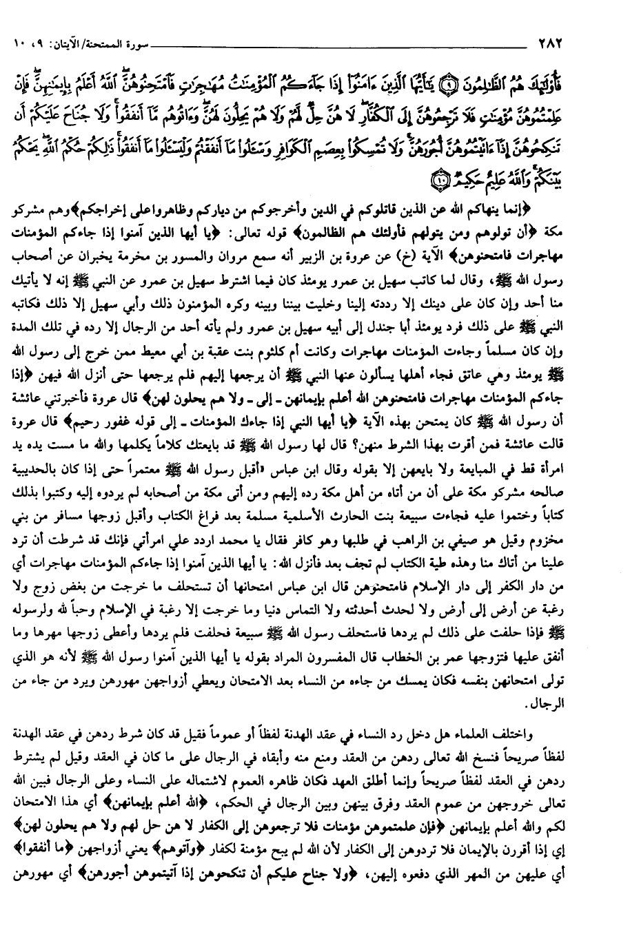 إِنَّما يَنْهاكُمُ اللَّهُ عَنِ الَّذِينَ قاتَلُوكُمْ فِي الدِّينِ وَأَخْرَجُوكُمْ مِنْ دِيارِكُمْ وَظاهَرُوا عَلى إِخْراجِكُمْ أَنْ تَوَلَّوْهُمْ وَمَنْ يَتَوَلَّهُمْ فَأُولئِكَ هُمُ الظَّالِمُونَ (9) يا أَيُّهَا الَّذِينَ آمَنُوا إِذا جاءَكُمُ الْمُؤْمِناتُ مُهاجِراتٍ فَامْتَحِنُوهُنَّ اللَّهُ أَعْلَمُ بِإِيمانِهِنَّ فَإِنْ عَلِمْتُمُوهُنَّ مُؤْمِناتٍ فَلا تَرْجِعُوهُنَّ إِلَى الْكُفَّارِ لا هُنَّ حِلٌّ لَهُمْ وَلا هُمْ يَحِلُّونَ لَهُنَّ وَآتُوهُمْ ما أَنْفَقُوا وَلا جُناحَ عَلَيْكُمْ أَنْ تَنْكِحُوهُنَّ إِذا آتَيْتُمُوهُنَّ أُجُورَهُنَّ وَلا تُمْسِكُوا بِعِصَمِ الْكَوافِرِ وَسْئَلُوا ما أَنْفَقْتُمْ وَلْيَسْئَلُوا ما أَنْفَقُوا ذلِكُمْ حُكْمُ اللَّهِ يَحْكُمُ بَيْنَكُمْ وَاللَّهُ عَلِيمٌ حَكِيمٌ (10)