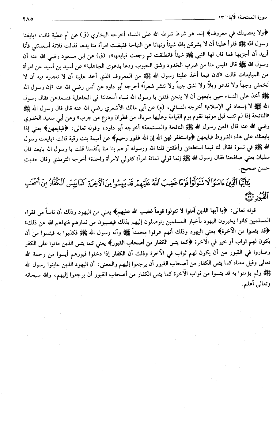 «النائحة إذا لم تتب قبل موتها تقوم يوم القيامة وعليها سربال من قطران ودرع من جرب» وعن أبي سعيد الخدري رضي الله عنه قال «لعن رسول الله صلّى الله عليه وسلّم النائحة والمستمعة» أخرجه أبو داود، وقوله تعالى: فَبايِعْهُنَّ يعني إذا بايعنك على هذه الشروط فبايعهن وَاسْتَغْفِرْ لَهُنَّ اللَّهَ إِنَّ اللَّهَ غَفُورٌ رَحِيمٌ عن أميمة بنت رقية قالت «بايعت رسول الله صلّى الله عليه وسلّم في نسوة فقال لنا فيما استطعتن وأطقتن قلنا الله ورسوله أرحم بنا منا بأنفسنا قلت يا رسول الله بايعنا قال سفيان يعني صافحنا فقال رسول الله صلّى الله عليه وسلّم إنما قولي لمائة امرأة كقولي لامرأة واحدة» أخرجه الترمذي وقال حديث حسن صحيح.