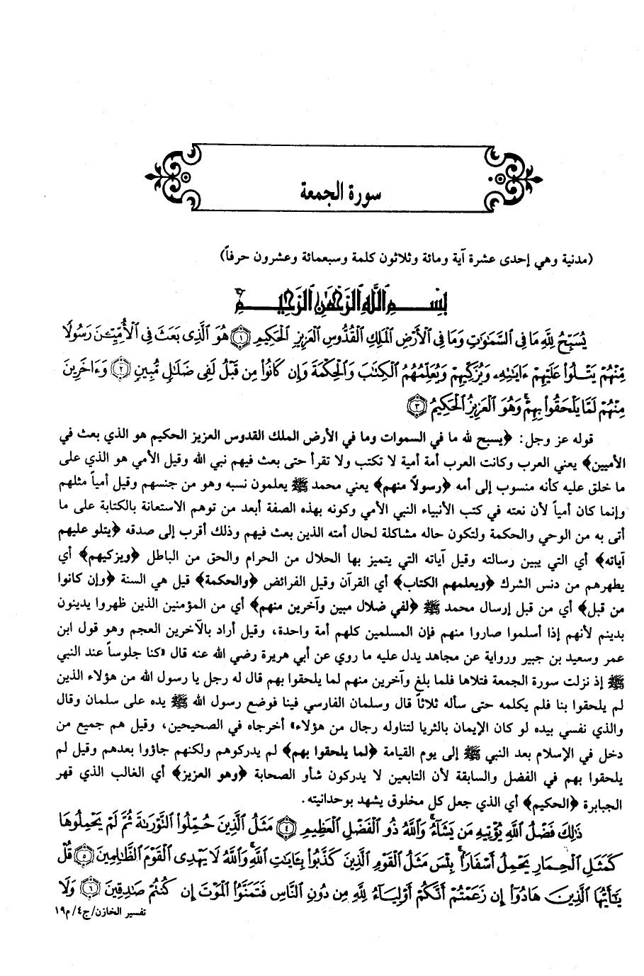 يُسَبِّحُ لِلَّهِ ما فِي السَّماواتِ وَما فِي الْأَرْضِ الْمَلِكِ الْقُدُّوسِ الْعَزِيزِ الْحَكِيمِ (1) هُوَ الَّذِي بَعَثَ فِي الْأُمِّيِّينَ رَسُولاً مِنْهُمْ يَتْلُوا عَلَيْهِمْ آياتِهِ وَيُزَكِّيهِمْ وَيُعَلِّمُهُمُ الْكِتابَ وَالْحِكْمَةَ وَإِنْ كانُوا مِنْ قَبْلُ لَفِي ضَلالٍ مُبِينٍ (2) وَآخَرِينَ مِنْهُمْ لَمَّا يَلْحَقُوا بِهِمْ وَهُوَ الْعَزِيزُ الْحَكِيمُ (3)