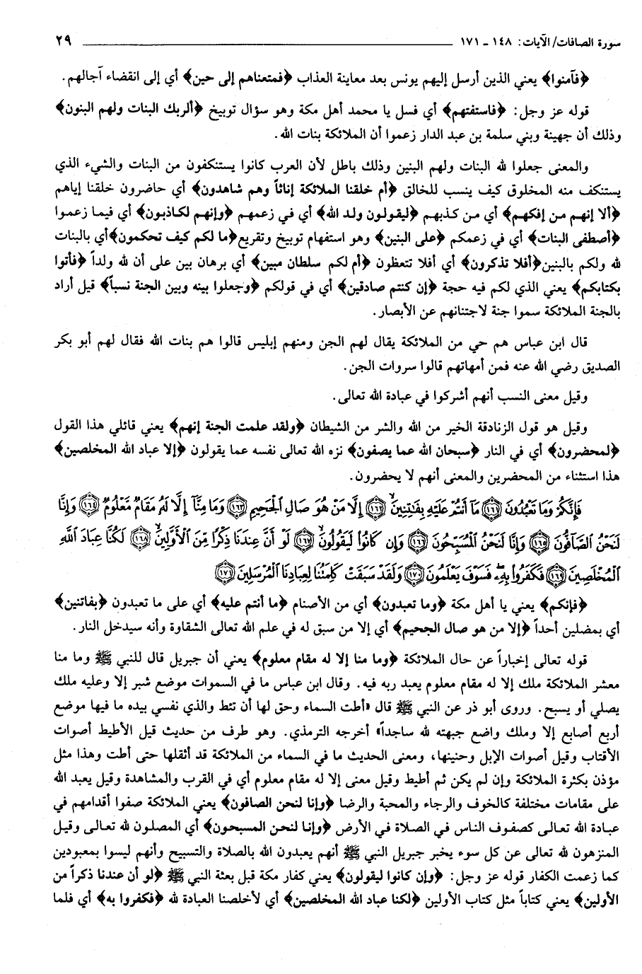 قوله تعالى إخبارا عن حال الملائكة وَما مِنَّا إِلَّا لَهُ مَقامٌ مَعْلُومٌ يعني أن جبريل قال للنبي صلّى الله عليه وسلّم وما منا معشر الملائكة ملك إلا له مقام معلوم يعبد ربه فيه. وقال ابن عباس ما في السموات موضع شبر إلا وعليه ملك يصلي أو يسبح. وروى أبو ذر عن النبي صلّى الله عليه وسلّم قال «أطت السماء وحق لها أن تئط والذي نفسي بيده ما فيها موضع أربع أصابع إلا وملك واضع جبهته لله ساجدا» أخرجه الترمذي. وهو طرف من حديث قيل الأطيط أصوات الأقتاب وقيل أصوات الإبل وحنينها، ومعنى الحديث ما في السماء من الملائكة قد أثقلها حتى أطت وهذا مثل مؤذن بكثرة الملائكة وإن لم يكن ثم أطيط وقيل معنى إلا له مقام معلوم أي في القرب والمشاهدة وقيل يعبد الله على مقامات مختلفة كالخوف والرجاء والمحبة والرضا وَإِنَّا لَنَحْنُ الصَّافُّونَ يعني الملائكة صفوا أقدامهم في عبادة الله تعالى كصفوف الناس في الصلاة في الأرض وَإِنَّا لَنَحْنُ الْمُسَبِّحُونَ أي المصلون لله تعالى وقيل المنزهون لله تعالى عن كل سوء يخبر جبريل النبي صلّى الله عليه وسلّم أنهم يعبدون الله بالصلاة والتسبيح وأنهم ليسوا بمعبودين كما زعمت الكفار قوله عز وجل: وَإِنْ كانُوا لَيَقُولُونَ يعني كفار مكة قبل بعثة النبي صلّى الله عليه وسلّم لَوْ أَنَّ عِنْدَنا ذِكْراً مِنَ الْأَوَّلِينَ يعني كتابا مثل كتاب الأولين لَكُنَّا عِبادَ اللَّهِ الْمُخْلَصِينَ أي لأخلصنا العبادة لله فَكَفَرُوا بِهِ أي فلما