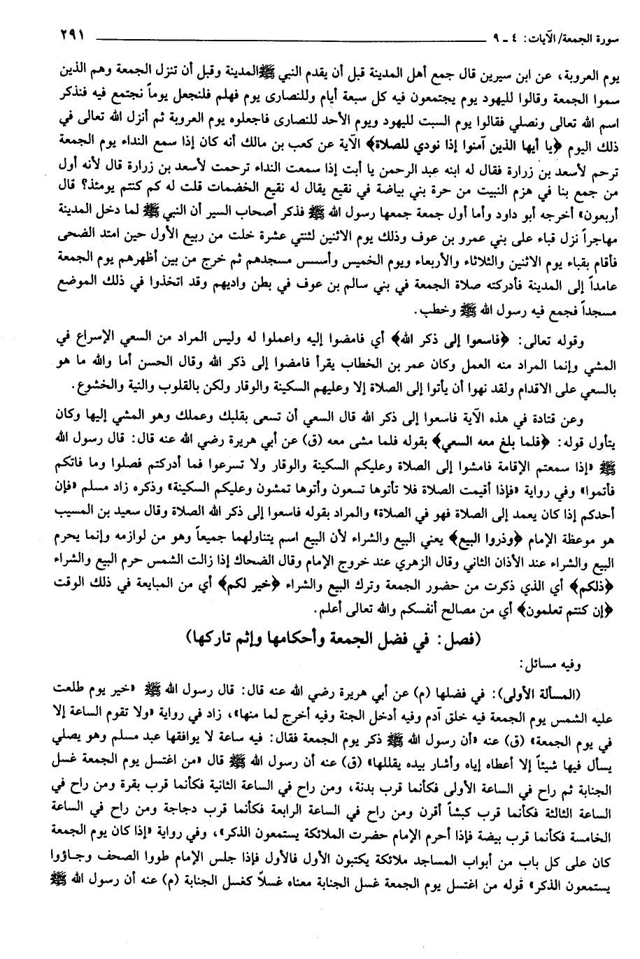 (المسألة الأولى): في فضلها (م) عن أبي هريرة رضي الله عنه قال: قال رسول الله صلّى الله عليه وسلّم «خير يوم طلعت عليه الشمس يوم الجمعة فيه خلق آدم وفيه أدخل الجنة وفيه أخرج لما منها»، زاد في رواية «ولا تقوم الساعة إلا في يوم الجمعة» (ق) عنه «أن رسول الله صلّى الله عليه وسلّم ذكر يوم الجمعة فقال: فيه ساعة لا يوافقها عبد مسلم وهو يصلي يسأل فيها شيئا إلا أعطاه إياه وأشار بيده يقللها» (ق) عنه أن رسول الله صلّى الله عليه وسلّم قال «من اغتسل يوم الجمعة غسل الجنابة ثم راح في الساعة الأولى فكأنما قرب بدنة، ومن راح في الساعة الثانية فكأنما قرب بقرة ومن راح في الساعة الثالثة فكأنما قرب كبشا أقرن ومن راح في الساعة الرابعة فكأنما قرب دجاجة ومن راح في الساعة الخامسة فكأنما قرب بيضة فإذا أحرم الإمام حضرت الملائكة يستمعون الذكر»، وفي رواية «إذا كان يوم الجمعة كان على كل باب من أبواب المساجد ملائكة يكتبون الأول فالأول فإذا جلس الإمام طووا الصحف وجاءوا يستمعون الذكر» قوله من اغتسل يوم الجمعة غسل الجنابة معناه غسلا كغسل الجنابة (م) عنه أن رسول الله صلّى الله عليه وسلّم