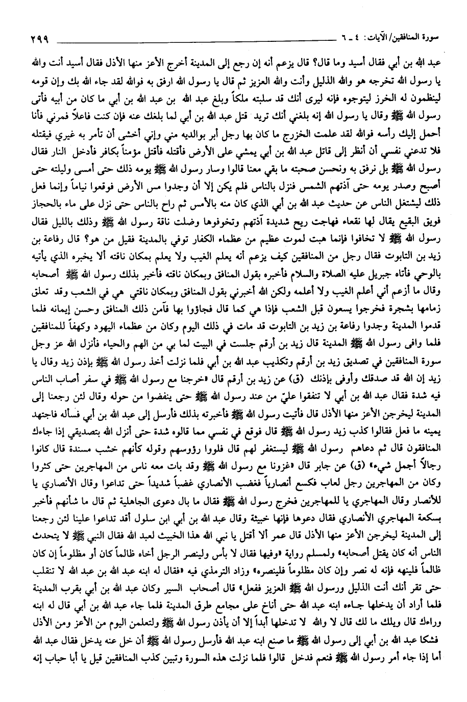 وإني أخشى أن تأمر به غيري فيقتله فلا تدعني نفسي أن أنظر إلى قاتل عبد الله بن أبي يمشي على الأرض فأقتله فأقتل مؤمنا بكافر فأدخل النار فقال رسول الله صلّى الله عليه وسلّم بل نرفق به ونحسن صحبته ما بقي معنا قالوا وسار رسول الله صلّى الله عليه وسلّم يومه ذلك حتى أمسى وليلته حتى أصبح وصدر يومه حتى آذتهم الشمس فنزل بالناس فلم يكن إلا أن وجدوا مس الأرض فوقعوا نياما وإنما فعل ذلك ليشتغل الناس عن حديث عبد الله بن أبي الذي كان منه بالأمس ثم راح بالناس حتى نزل على ماء بالحجاز فويق البقيع يقال لها نقعاء فهاجت ريح شديدة آذتهم وتخوفوها وضلت ناقة رسول الله صلّى الله عليه وسلّم وذلك بالليل فقال رسول الله صلّى الله عليه وسلّم لا تخافوا فإنما هبت لموت عظيم من عظماء الكفار توفي بالمدينة فقيل من هو؟ قال رفاعة بن زيد بن التابوت فقال رجل من المنافقين كيف يزعم أنه يعلم الغيب ولا يعلم بمكان ناقته ألا يخبره الذي يأتيه بالوحي فأتاه جبريل عليه الصلاة والسلام فأخبره بقول المنافق وبمكان ناقته فأخبر بذلك رسول الله صلّى الله عليه وسلّم أصحابه وقال ما أزعم أني أعلم الغيب ولا أعلمه ولكن الله أخبرني بقول المنافق وبمكان ناقتي هي في الشعب وقد تعلق زمامها بشجرة فخرجوا يسعون قبل الشعب فإذا هي كما قال فجاؤوا بها فآمن ذلك المنافق وحسن إيمانه فلما قدموا المدينة وجدوا رفاعة بن زيد بن التابوت قد مات في ذلك اليوم وكان من عظماء اليهود وكهفا للمنافقين فلما وافى رسول الله صلّى الله عليه وسلّم المدينة قال زيد بن أرقم جلست في البيت لما بي من الهم والحياء فأنزل الله عز وجل سورة المنافقين في تصديق زيد بن أرقم وتكذيب عبد الله بن أبي فلما نزلت أخذ رسول الله صلّى الله عليه وسلّم بإذن زيد وقال يا زيد إن الله قد صدقك وأوفى بإذنك (ق) عن زيد بن أرقم قال «خرجنا مع رسول الله صلّى الله عليه وسلّم في سفر أصاب الناس فيه شدة فقال عبد الله بن أبي لا تنفقوا عليّ من عند رسول الله صلّى الله عليه وسلّم حتى ينفضوا من حوله وقال لئن رجعنا إلى المدينة ليخرجن الأعز منها الأذل قال فأتيت رسول الله صلّى الله عليه وسلّم فأخبرته بذلك فأرسل إلى عبد الله بن أبي فسأله فاجتهد يمينه ما فعل فقالوا كذب زيد رسول الله صلّى الله عليه وسلّم قال فوقع في نفسي مما قالوه شدة حتى أنزل الله بتصديقي إذا جاءك المنافقون قال ثم دعاهم رسول الله صلّى الله عليه وسلّم ليستغفر لهم قال فلووا رؤوسهم وقوله كأنهم خشب مسندة قال كانوا رجالا أجمل شيء» (ق) عن جابر قال «غزونا مع رسول الله صلّى الله عليه وسلّم وقد بات معه ناس من المهاجرين حتى كثروا وكان من المهاجرين رجل لعاب فكسع أنصاريا فغضب الأنصاري غضبا شديدا حتى تداعوا وقال الأنصاري يا للأنصار وقال المهاجري يا للمهاجرين فخرج رسول الله صلّى الله عليه وسلّم فقال ما بال دعوى الجاهلية ثم قال ما شأنهم فأخبر بسكعة المهاجري الأنصاري فقال دعوها فإنها خبيثة وقال عبد الله بن أبي ابن سلول أقد تداعوا علينا لئن رجعنا إلى المدينة ليخرجن الأعز منها الأذل قال عمر ألا أقتل يا نبي الله هذا الخبيث لعبد الله فقال النبي صلّى الله عليه وسلّم لا يتحدث الناس أنه كان يقتل أصحابه» ولمسلم رواية «وفيها فقال لا بأس ولينصر الرجل أخاه ظالما كان أو مظلوما إن كان ظالما فلينهه فإنه له نصر وإن كان مظلوما فلينصره» وزاد الترمذي فيه «فقال له ابنه عبد الله بن عبد الله لا تنقلب حتى تقر أنك أنت الذليل ورسول الله صلّى الله عليه وسلّم العزيز ففعل» قال أصحاب السير وكان عبد الله بن أبي بقرب المدينة فلما أراد أن يدخلها جاءه ابنه عبد الله حتى أناخ على مجامع طرق المدينة فلما جاء عبد الله بن أبي قال له ابنه وراءك قال ويلك ما لك قال لا والله لا تدخلها أبدا إلا أن يأذن رسول الله صلّى الله عليه وسلّم ولتعلمن اليوم من الأعز ومن الأذل فشكا عبد الله بن أبي إلى رسول الله صلّى الله عليه وسلّم ما