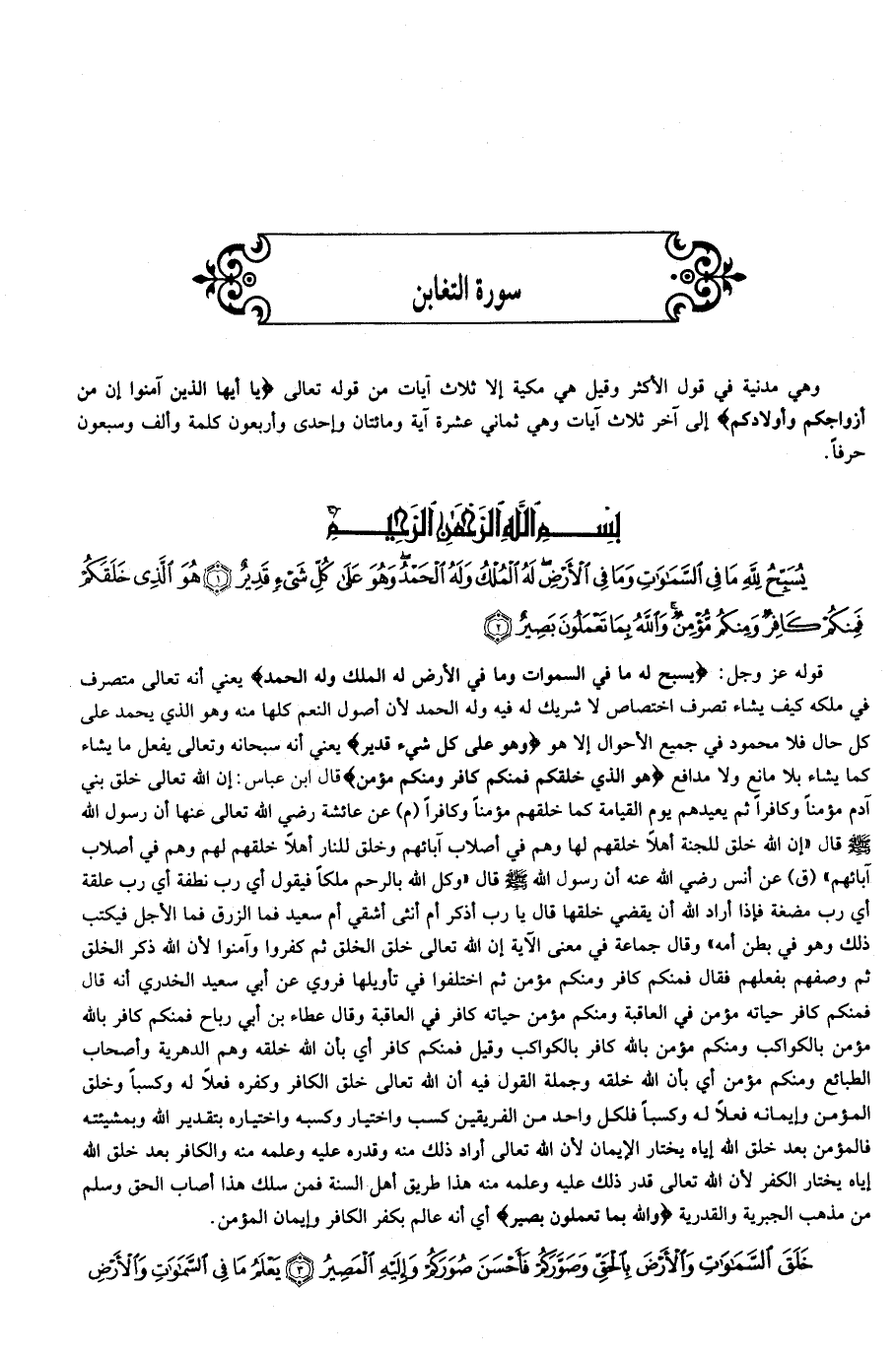 يُسَبِّحُ لِلَّهِ ما فِي السَّماواتِ وَما فِي الْأَرْضِ لَهُ الْمُلْكُ وَلَهُ الْحَمْدُ وَهُوَ عَلى كُلِّ شَيْءٍ قَدِيرٌ (1) هُوَ الَّذِي خَلَقَكُمْ فَمِنْكُمْ كافِرٌ وَمِنْكُمْ مُؤْمِنٌ وَاللَّهُ بِما تَعْمَلُونَ بَصِيرٌ (2)