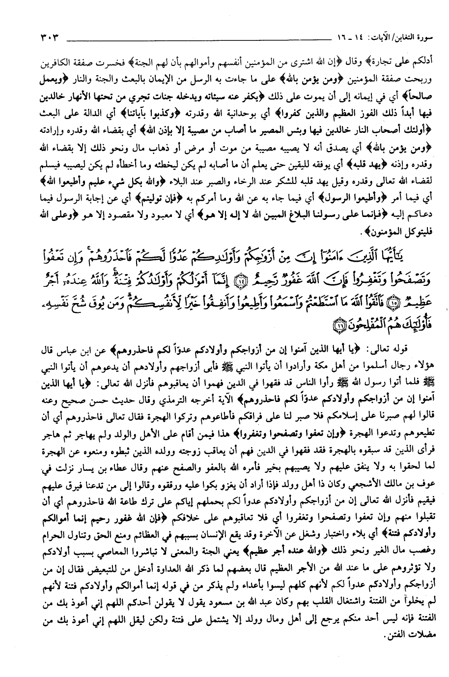 يا أَيُّهَا الَّذِينَ آمَنُوا إِنَّ مِنْ أَزْواجِكُمْ وَأَوْلادِكُمْ عَدُوًّا لَكُمْ فَاحْذَرُوهُمْ وَإِنْ تَعْفُوا وَتَصْفَحُوا وَتَغْفِرُوا فَإِنَّ اللَّهَ غَفُورٌ رَحِيمٌ (14) إِنَّما أَمْوالُكُمْ وَأَوْلادُكُمْ فِتْنَةٌ وَاللَّهُ عِنْدَهُ أَجْرٌ عَظِيمٌ (15) فَاتَّقُوا اللَّهَ مَا اسْتَطَعْتُمْ وَاسْمَعُوا وَأَطِيعُوا وَأَنْفِقُوا خَيْراً لِأَنْفُسِكُمْ وَمَنْ يُوقَ شُحَّ نَفْسِهِ فَأُولئِكَ هُمُ الْمُفْلِحُونَ (16)
