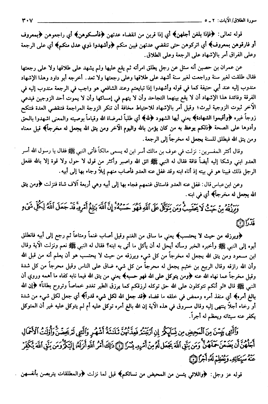 فَإِذا بَلَغْنَ أَجَلَهُنَّ فَأَمْسِكُوهُنَّ بِمَعْرُوفٍ أَوْ فارِقُوهُنَّ بِمَعْرُوفٍ وَأَشْهِدُوا ذَوَيْ عَدْلٍ مِنْكُمْ وَأَقِيمُوا الشَّهادَةَ لِلَّهِ ذلِكُمْ يُوعَظُ بِهِ مَنْ كانَ يُؤْمِنُ بِاللَّهِ وَالْيَوْمِ الْآخِرِ وَمَنْ يَتَّقِ اللَّهَ يَجْعَلْ لَهُ مَخْرَجاً (2)