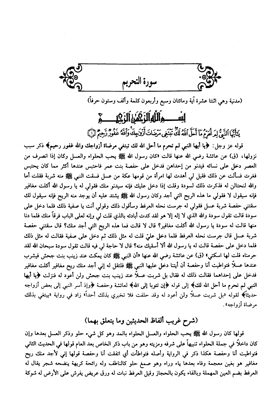 قوله عز وجل: يا أَيُّهَا النَّبِيُّ لِمَ تُحَرِّمُ ما أَحَلَّ اللَّهُ لَكَ تَبْتَغِي مَرْضاتَ أَزْواجِكَ وَاللَّهُ غَفُورٌ رَحِيمٌ ذكر سبب نزولها، (ق) عن عائشة رضي الله عنها قالت «كان رسول الله صلّى الله عليه وسلّم يحب الحلواء والعسل وكان إذا انصرف من العصر دخل على نسائه فيدنو من إحداهن فدخل على حفصة بنت عمر فاحتبس عندها أكثر مما كان يحتبس فغرت فسألت عن ذلك فقيل لي أهدت لها امرأة من قومها عكة من عسل فسقت النبي صلّى الله عليه وسلّم منه شربة فقلت أما والله لنحتالن له فذكرت ذلك لسودة وقلت إذا دخل عليك فإنه سيدنو منك فقولي له يا رسول الله أكلت مغافير فإنه سيقول لا فقولي ما هذه الريح التي أجد وكان رسول الله صلّى الله عليه وسلّم يشتد عليه أن يوجد منه الريح فإنه سيقول لك سقتني حفصة شربة عسل فقولي له جرست نحله العرفط وسأقول ذلك وقولي أنت يا صفية ذلك فلما دخل على سودة قالت تقول سودة والله الذي لا إله إلا هو لقد كدت أبادئه بالذي قلت لي وإنه لعلى الباب فرقا منك فلما دنا منها قالت له سودة يا رسول الله أكلت مغافير؟ قال لا قالت فما هذه الريح التي أجد منك؟ قال سقتني حفصة شربة عسل قال جرست نحله العرفط فلما دخل عليّ قلت له مثل ذلك ثم دخل على صفية فقالت له مثل ذلك فلما دخل على حفصة قالت له يا رسول الله ألا أسقيك منه؟ قال لا حاجة لي فيه قالت تقول سودة سبحان الله لقد حرمناه قلت لها اسكتي» (ق) عن عائشة رضي الله عنها «أن النبي صلّى الله عليه وسلّم كان يمكث عند زينب بنت جحش فيشرب عندها عسلا فتواطيت أنا وحفصة أنا أيتنا دخل عليها النبي صلّى الله عليه وسلّم فلتقل له إني أجد منك ريح مغافير أكلت مغافير فدخل على إحداهما فقالت ذلك له فقال بل شربت عسلا عند زينب بنت جحش ولن أعود له فنزلت يا أَيُّهَا النَّبِيُّ لِمَ تُحَرِّمُ ما أَحَلَّ اللَّهُ لَكَ إلى قوله إِنْ تَتُوبا إِلَى اللَّهِ لعائشة وحفصة وَإِذْ أَسَرَّ النَّبِيُّ إِلى بَعْضِ أَزْواجِهِ حَدِيثاً لقوله «بل شربت عسلا ولن أعود له وقد حلفت فلا تخبري بذلك أحدا» زاد في رواية «يبتغي بذلك مرضاة أزواجه».