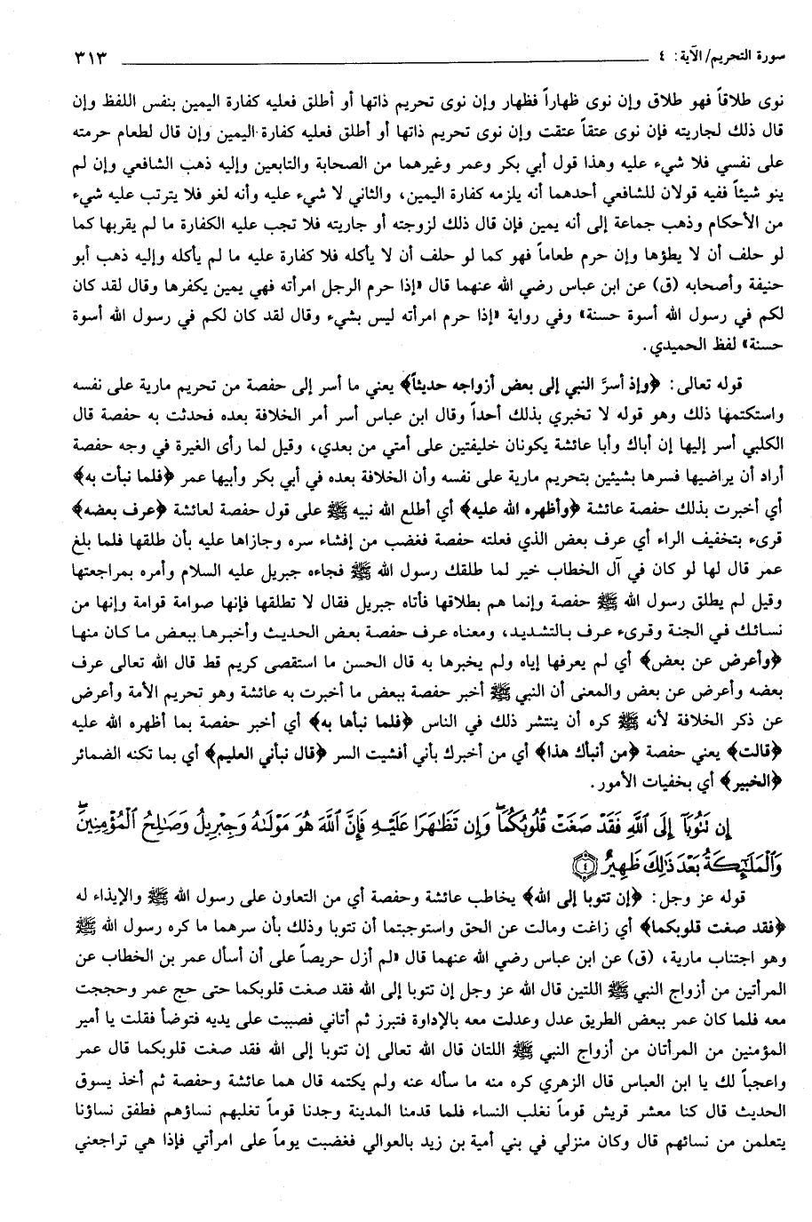 قوله عز وجل: إِنْ تَتُوبا إِلَى اللَّهِ يخاطب عائشة وحفصة أي من التعاون على رسول الله صلّى الله عليه وسلّم والإيذاء له فَقَدْ صَغَتْ قُلُوبُكُما أي زاغت ومالت عن الحق واستوجبتما أن تتوبا وذلك بأن سرهما ما كره رسول الله صلّى الله عليه وسلّم وهو اجتناب مارية، (ق) عن ابن عباس رضي الله عنهما قال «لم أزل حريصا على أن أسأل عمر بن الخطاب عن المرأتين من أزواج النبي صلّى الله عليه وسلّم اللتين قال الله عز وجل إن تتوبا إلى الله فقد صغت قلوبكما حتى حج عمر وحججت معه فلما كان عمر ببعض الطريق عدل وعدلت معه بالإداوة فتبرز ثم أتاني فصببت على يديه فتوضأ فقلت يا أمير المؤمنين من المرأتان من أزواج النبي صلّى الله عليه وسلّم اللتان قال الله تعالى إن تتوبا إلى الله فقد صغت قلوبكما قال عمر وا عجبا لك يا ابن العباس قال الزهري كره منه ما سأله عنه ولم يكتمه قال هما عائشة وحفصة ثم أخذ يسوق الحديث قال كنا معشر قريش قوما نغلب النساء فلما قدمنا المدينة وجدنا قوما تغلبهم نساؤهم فطفق نساؤنا يتعلمن من نسائهم قال وكان منزلي في بني أمية بن زيد بالعوالي فغضبت يوما على امرأتي فإذا هي تراجعني