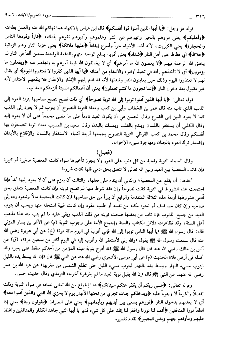 يا أَيُّهَا الَّذِينَ آمَنُوا قُوا أَنْفُسَكُمْ وَأَهْلِيكُمْ ناراً وَقُودُهَا النَّاسُ وَالْحِجارَةُ عَلَيْها مَلائِكَةٌ غِلاظٌ شِدادٌ لا يَعْصُونَ اللَّهَ ما أَمَرَهُمْ وَيَفْعَلُونَ ما يُؤْمَرُونَ (6) يا أَيُّهَا الَّذِينَ كَفَرُوا لا تَعْتَذِرُوا الْيَوْمَ إِنَّما تُجْزَوْنَ ما كُنْتُمْ تَعْمَلُونَ (7) يا أَيُّهَا الَّذِينَ آمَنُوا تُوبُوا إِلَى اللَّهِ تَوْبَةً نَصُوحاً عَسى رَبُّكُمْ أَنْ يُكَفِّرَ عَنْكُمْ سَيِّئاتِكُمْ وَيُدْخِلَكُمْ جَنَّاتٍ تَجْرِي مِنْ تَحْتِهَا الْأَنْهارُ يَوْمَ لا يُخْزِي اللَّهُ النَّبِيَّ وَالَّذِينَ آمَنُوا مَعَهُ نُورُهُمْ يَسْعى بَيْنَ أَيْدِيهِمْ وَبِأَيْمانِهِمْ يَقُولُونَ رَبَّنا أَتْمِمْ لَنا نُورَنا وَاغْفِرْ لَنا إِنَّكَ عَلى كُلِّ شَيْءٍ قَدِيرٌ (8) يا أَيُّهَا النَّبِيُّ جاهِدِ الْكُفَّارَ وَالْمُنافِقِينَ وَاغْلُظْ عَلَيْهِمْ وَمَأْواهُمْ جَهَنَّمُ وَبِئْسَ الْمَصِيرُ (9)