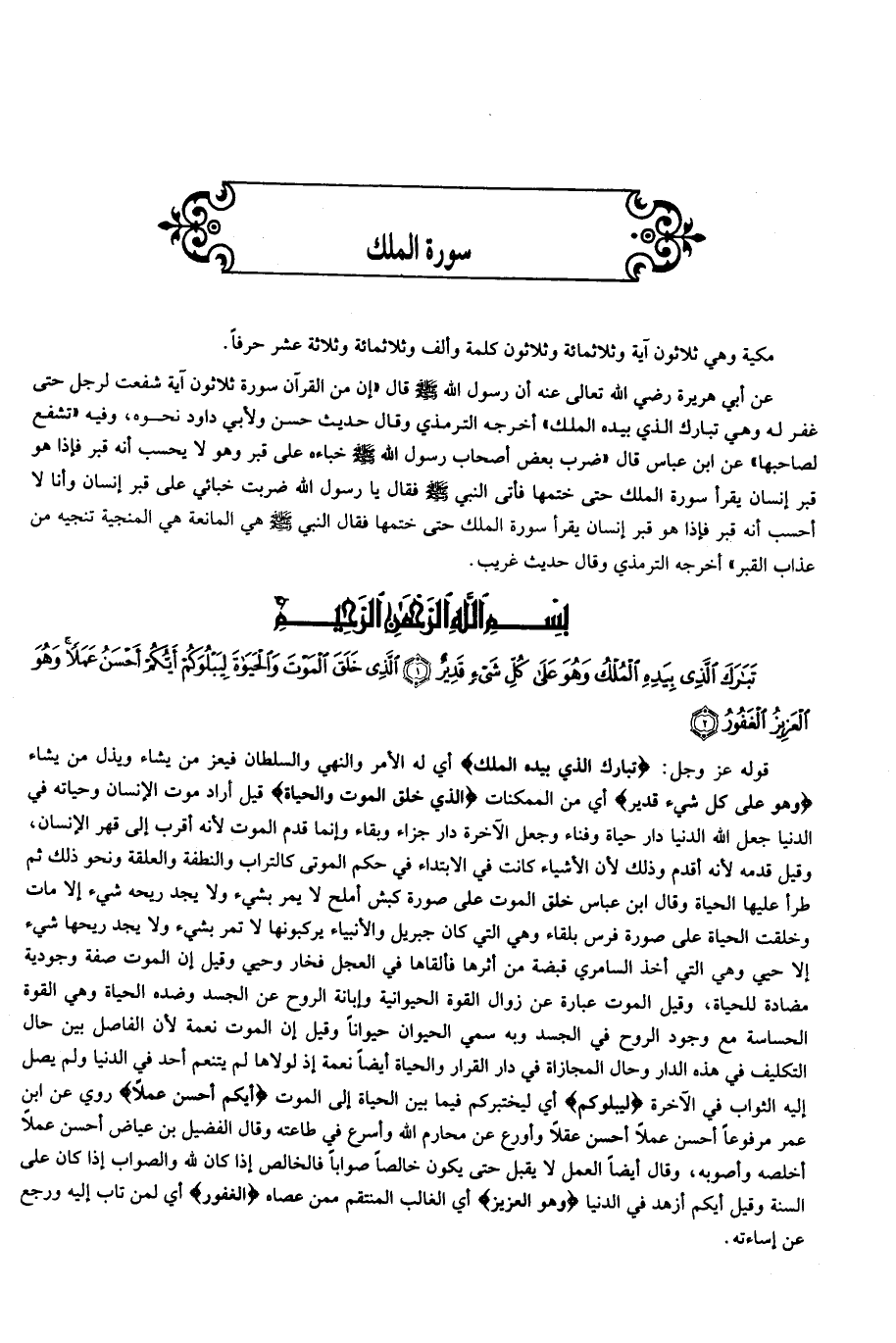 تَبارَكَ الَّذِي بِيَدِهِ الْمُلْكُ وَهُوَ عَلى كُلِّ شَيْءٍ قَدِيرٌ (1) الَّذِي خَلَقَ الْمَوْتَ وَالْحَياةَ لِيَبْلُوَكُمْ أَيُّكُمْ أَحْسَنُ عَمَلاً وَهُوَ الْعَزِيزُ الْغَفُورُ (2)
