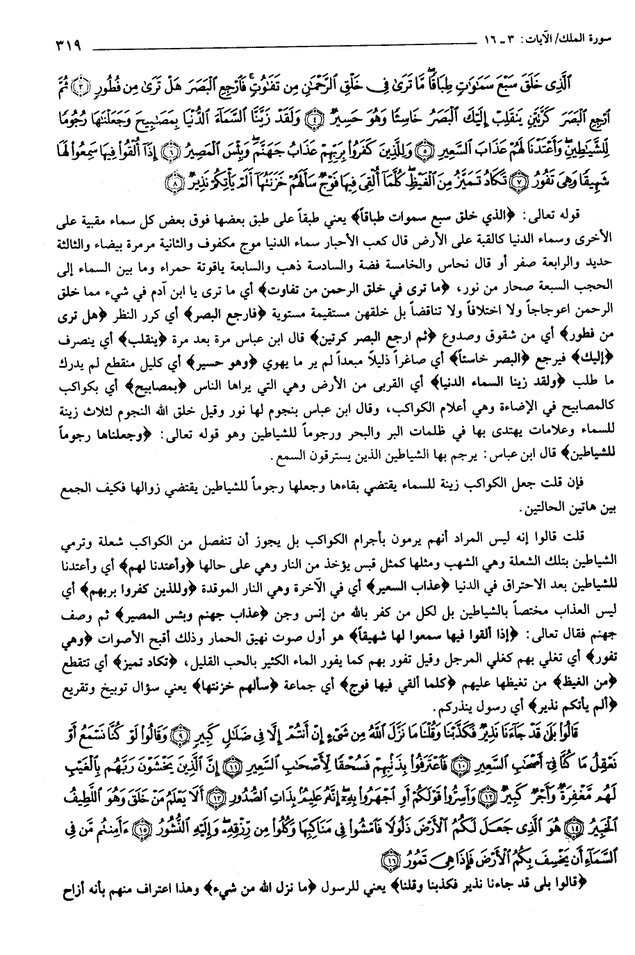 الَّذِي خَلَقَ سَبْعَ سَماواتٍ طِباقاً ما تَرى فِي خَلْقِ الرَّحْمنِ مِنْ تَفاوُتٍ فَارْجِعِ الْبَصَرَ هَلْ تَرى مِنْ فُطُورٍ (3) ثُمَّ ارْجِعِ الْبَصَرَ كَرَّتَيْنِ يَنْقَلِبْ إِلَيْكَ الْبَصَرُ خاسِئاً وَهُوَ حَسِيرٌ (4) وَلَقَدْ زَيَّنَّا السَّماءَ الدُّنْيا بِمَصابِيحَ وَجَعَلْناها رُجُوماً لِلشَّياطِينِ وَأَعْتَدْنا لَهُمْ عَذابَ السَّعِيرِ (5) وَلِلَّذِينَ كَفَرُوا بِرَبِّهِمْ عَذابُ جَهَنَّمَ وَبِئْسَ الْمَصِيرُ (6) إِذا أُلْقُوا فِيها سَمِعُوا لَها شَهِيقاً وَهِيَ تَفُورُ (7)