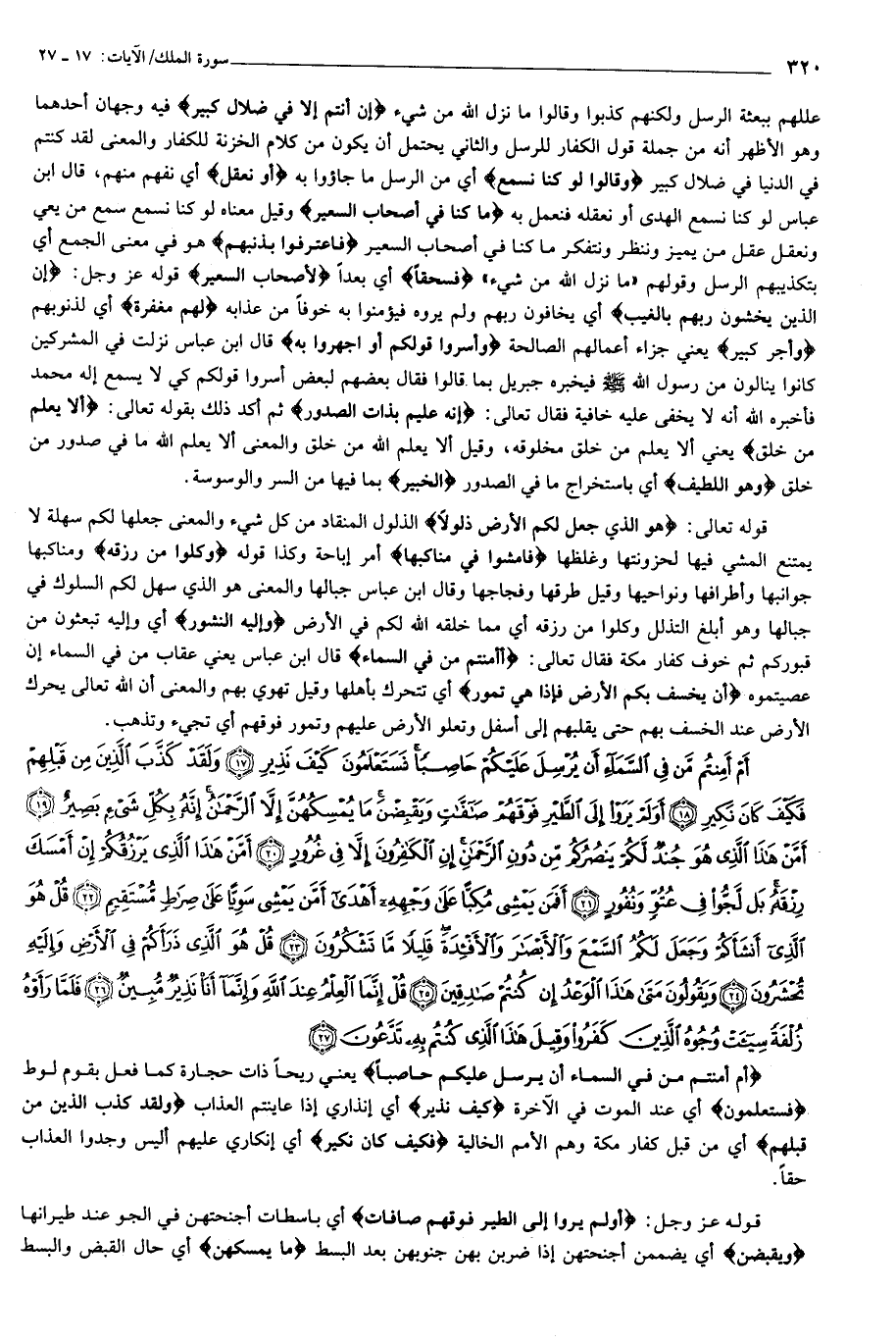 أَمْ أَمِنْتُمْ مَنْ فِي السَّماءِ أَنْ يُرْسِلَ عَلَيْكُمْ حاصِباً فَسَتَعْلَمُونَ كَيْفَ نَذِيرِ (17) وَلَقَدْ كَذَّبَ الَّذِينَ مِنْ قَبْلِهِمْ فَكَيْفَ كانَ نَكِيرِ (18) أَوَلَمْ يَرَوْا إِلَى الطَّيْرِ فَوْقَهُمْ صافَّاتٍ وَيَقْبِضْنَ ما يُمْسِكُهُنَّ إِلاَّ الرَّحْمنُ إِنَّهُ بِكُلِّ شَيْءٍ بَصِيرٌ (19) أَمَّنْ هذَا الَّذِي هُوَ جُنْدٌ لَكُمْ يَنْصُرُكُمْ مِنْ دُونِ الرَّحْمنِ إِنِ الْكافِرُونَ إِلاَّ فِي غُرُورٍ (20) أَمَّنْ هذَا الَّذِي يَرْزُقُكُمْ إِنْ أَمْسَكَ رِزْقَهُ بَلْ لَجُّوا فِي عُتُوٍّ وَنُفُورٍ (21)