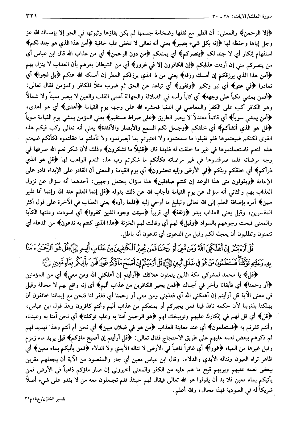 قُلْ أَرَأَيْتُمْ إِنْ أَهْلَكَنِيَ اللَّهُ وَمَنْ مَعِيَ أَوْ رَحِمَنا فَمَنْ يُجِيرُ الْكافِرِينَ مِنْ عَذابٍ أَلِيمٍ (28) قُلْ هُوَ الرَّحْمنُ آمَنَّا بِهِ وَعَلَيْهِ تَوَكَّلْنا فَسَتَعْلَمُونَ مَنْ هُوَ فِي ضَلالٍ مُبِينٍ (29) قُلْ أَرَأَيْتُمْ إِنْ أَصْبَحَ ماؤُكُمْ غَوْراً فَمَنْ يَأْتِيكُمْ بِماءٍ مَعِينٍ (30)